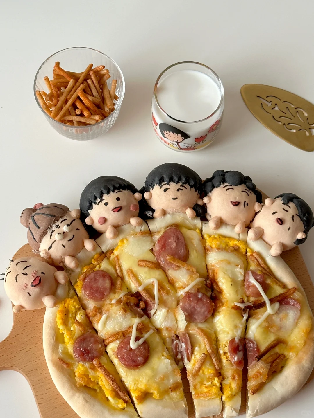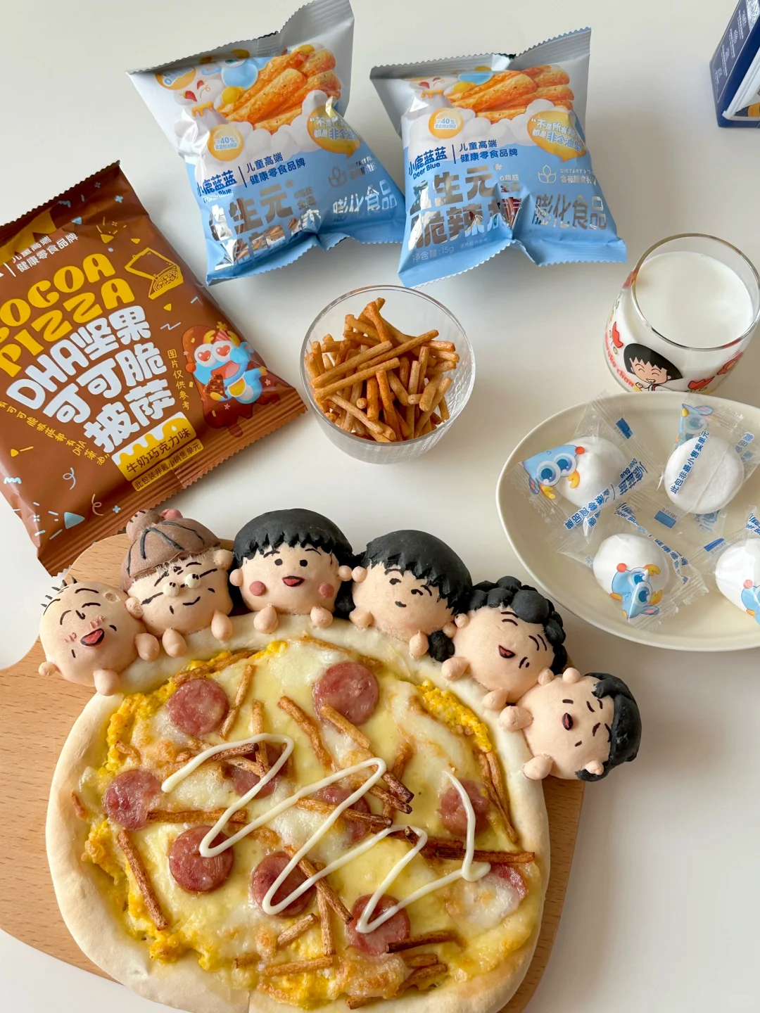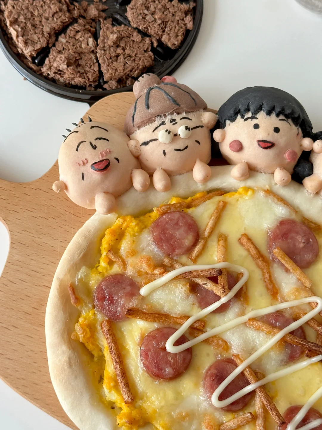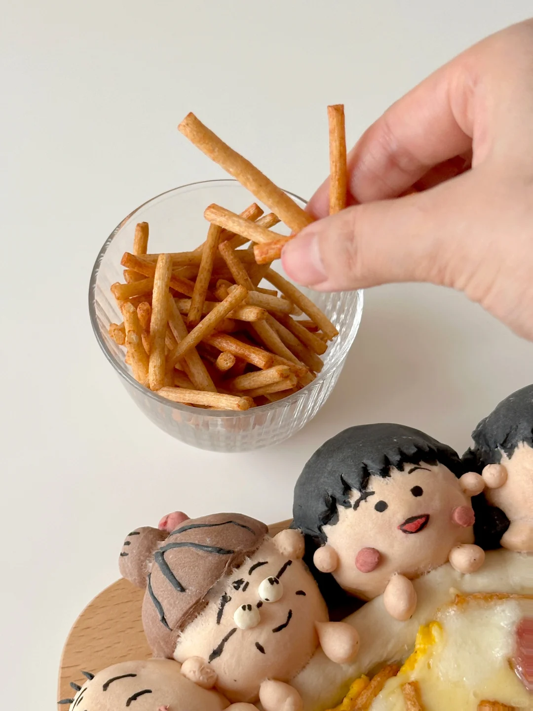 这次是可爱的小丸子一家人,每个脑袋里都包裹着满满的芝士~搭配鸡蛋沙拉火腿和脆辣棒~真的很好吃了