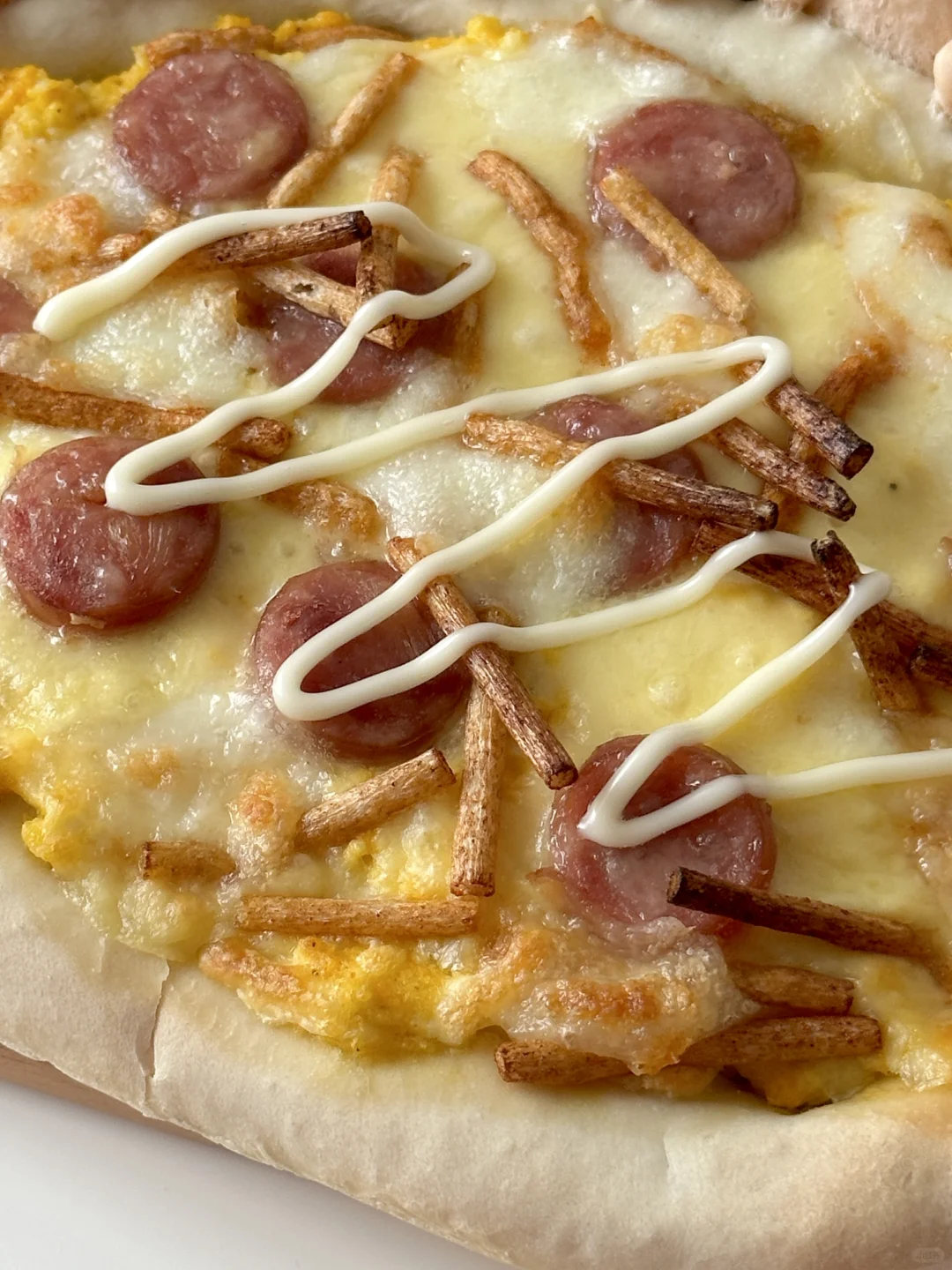 6️⃣披萨饼底用叉子插孔,铺上自制鸡蛋沙拉(两个煮熟的鸡蛋➕黑椒海盐➕沙拉酱),芝士碎,火腿,脆辣棒,奶酪等喜欢的食材