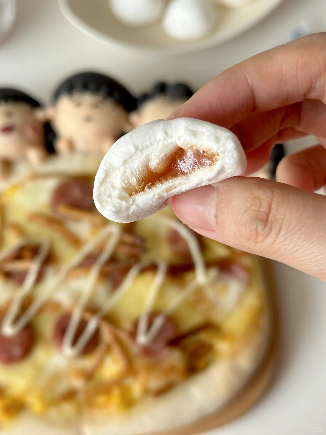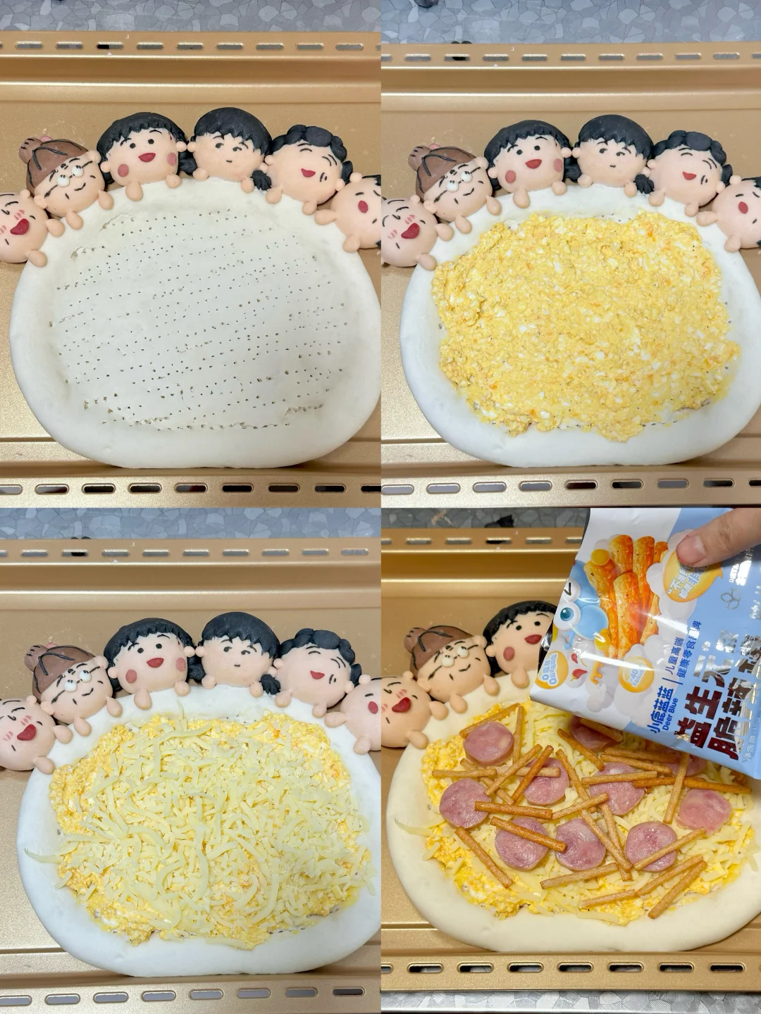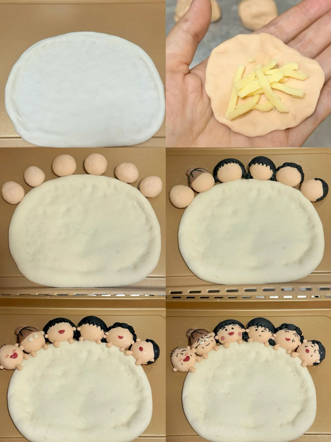 3️⃣面团排气揉光滑,分出150g制作小丸子和家人的形象,剩下的制作披萨饼底