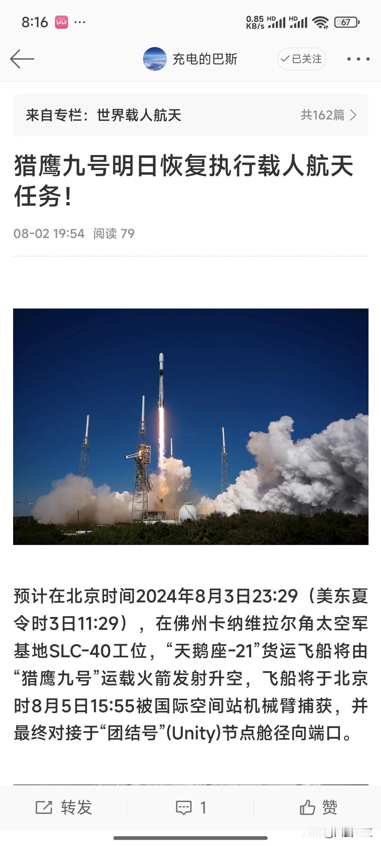 猎鹰九号明日恢复执行载人航天任务! 预计在北京时间2024年8月3日23:29(