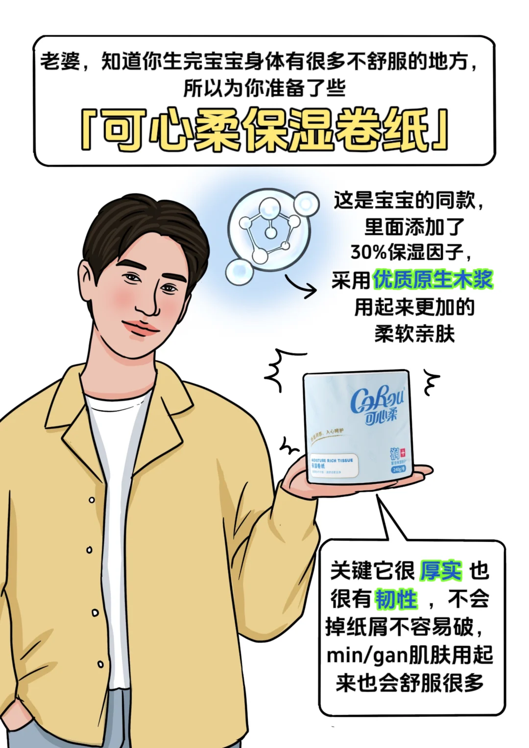 好在老公细心体贴,给我准备了「可心柔保湿卷纸」,它是添加保湿因子、更加柔软的纸巾很适合我,更适合产后妈妈的需求,也让我心情好了不少~