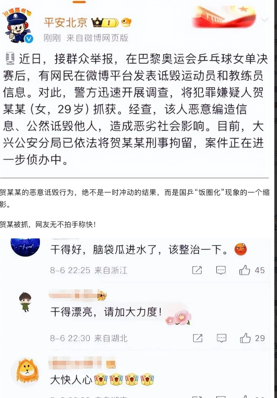 没想到黄谣女马琳这么快就归案了,必须为公安机关的高效点赞。前两天刷某博就恰好刷到黄谣女这条信息,当时觉得是丈二和尚摸不到头脑,仔细一看,这不是恶意中伤吗?后来又看到铺天盖地恶意揣测奥运冠军陈梦的消息,有趁机带节奏的、有无理谩骂的、还有吃瓜起哄的,就连一起吃饭的老阿姨都有以讹传讹的。当时就觉得这里面肯定有事儿,一个正常的人、正常的比赛,全靠一些毫无实锤的莫须有罪名就被黑成这样肯定不正常,背后说不定有黑手推动。果然,很快平安北京就官宣了,简直大快人心!