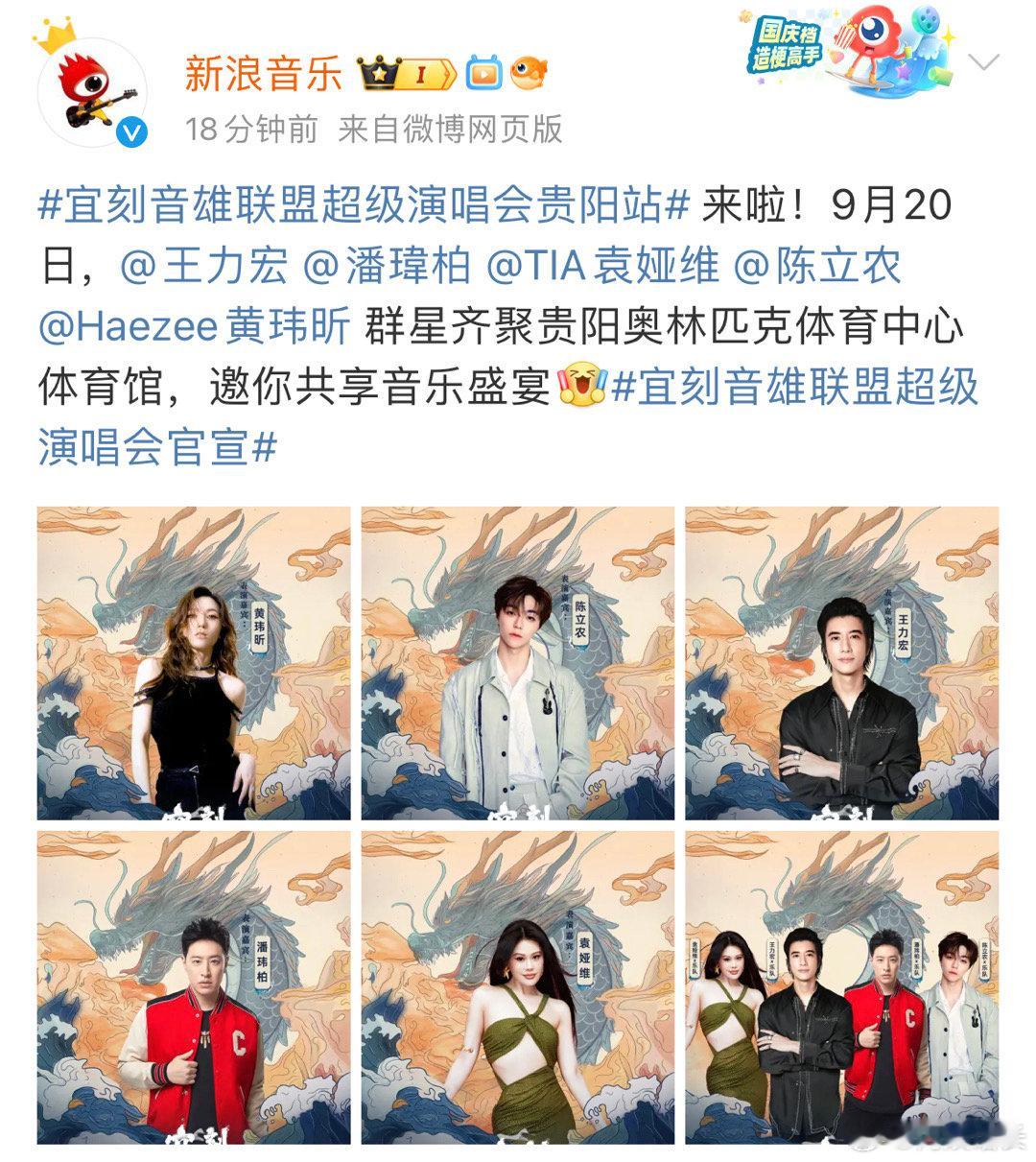 #宜刻音雄联盟超级演唱会贵阳站# 9月20日,王力宏的摇滚激情、潘玮柏的潮流节拍、袁娅维TIA的灵动歌声、陈立农的温暖旋律、Haezee黄玮昕的创新之音,汇聚一堂,只为你的耳朵而歌! #宜刻音雄联盟超级演唱会官宣# ​​​