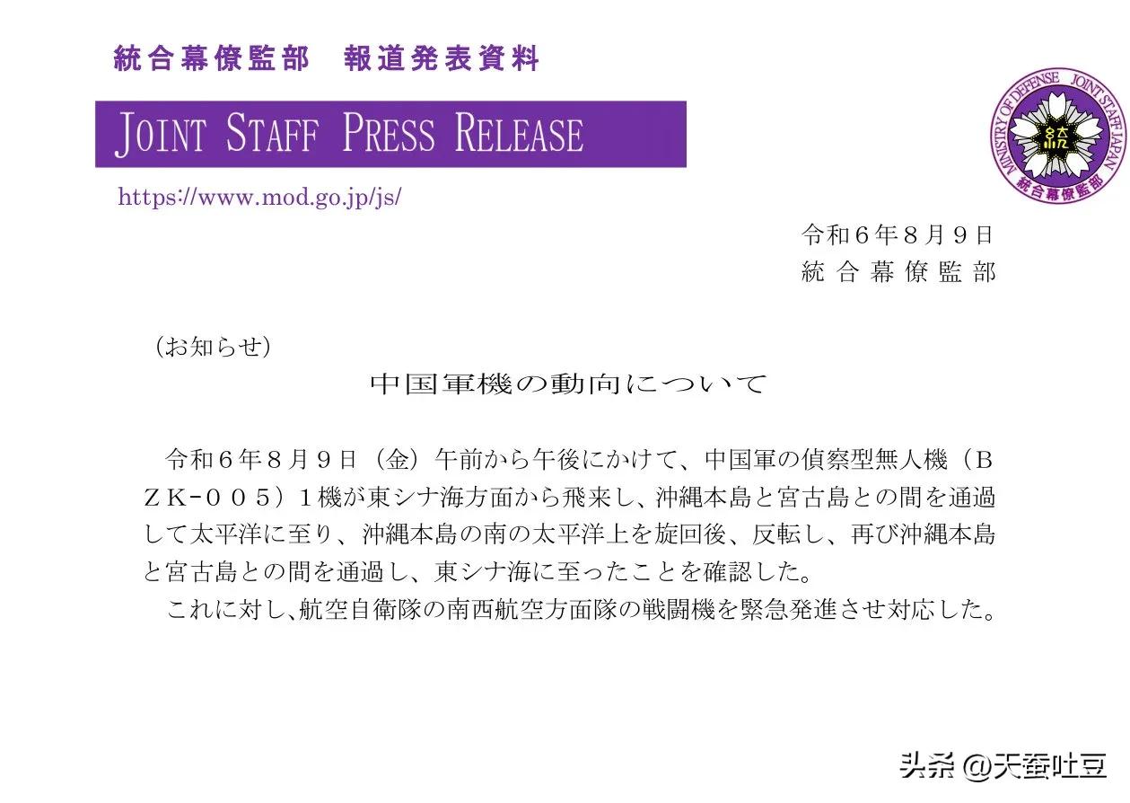 疑似新型BZK-005出宫古——根据日本防卫省发布的消息,8月9号,中国1架BZK-005型无人机通过宫古海峡上空进入西太平洋上空活动,并在琉球群岛冲绳岛以南空域盘旋后原路返回。 ➤这次的BZK-005还有些不一样,机头下方有不少刀状天线,机腹下还有一个疑似长方体雷达罩,或是类似于美军P-8A的AN/APS-154“先进机载传感器的同类产品,强化对地和对水面运动目标的检测和跟踪能力。#军事科技爱好者# #分享战机知识#