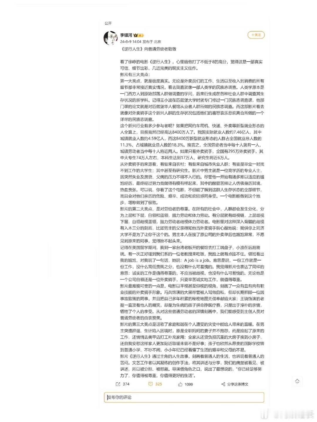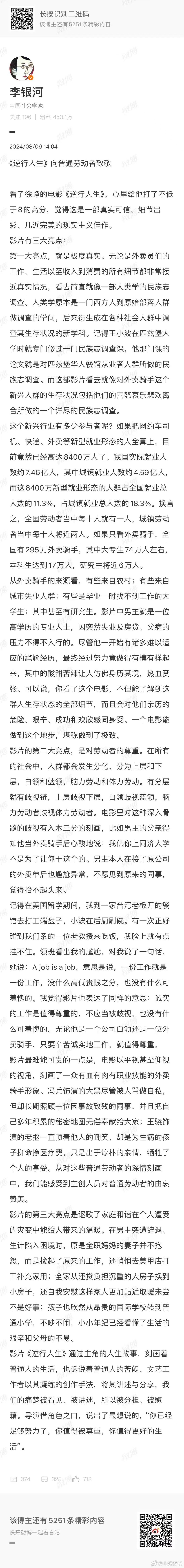 #逆行人生向普通劳动者致敬##李银河评逆行人生# 聆听李银河老师对《逆行人生》的看法,感恩普通劳动者的逆行。他们在平凡中创造奇迹,是生活的脊梁,让我们一起致敬!