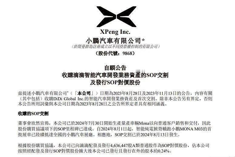 【小鹏完成收购滴滴智能汽车业务SOP交割 】8月13日晚间,小鹏汽车在港交所发布公告称,公司已于2024年7月30日开始生产量产车辆小鹏MONA M03(参数|询价)以向普通客户销售和交付,因此股份购买协议项下的SOP里程碑已达成。用通俗一些的话来讲,就是此前小鹏收购了滴滴的智能电动车业务,并根据不同的里程碑进行分段付款(股权类),此次是SOP里程碑的达成。根据最新消息,小鹏MONA M03将于8月27日上市,目前新车已经陆续抵达各地展厅。 自2024年8月1日起,小鹏MONA M03的首批展车已陆续抵达全国的小鹏汽车展厅。相应地,SOP交割已于2024年8月13日发生。根据股份购买协议,公司已向滴滴配发及发行4,636,447股A类普通股作为SOP对价股份,占公司按照经配发及发行SOP对价股份扩大后公司已发行且发行在外的股本约0.24%。 结合此前消息来看,2023年8月28日,小鹏汽车曾宣布,拟向滴滴出行发行对价股份,占交易完成后总股本3.25%的A类普通股,用以收购滴滴智能汽车开发业务资产,并与滴滴出行订立战略合作协议,双方计划推出MONA系列,进军紧凑型车市场。 根据双方合作协议,小鹏汽车计划分两个阶段向滴滴出行最高共计交付36万辆新品牌新车。如果业绩目标完成,小鹏汽车将向滴滴出行增发最高共计9113万股A类普通股,在配发后总股本中占比约5%(含3.25%收购滴滴智能汽车开发业务资产股份)。 小鹏汽车董事长兼CEO何小鹏曾表示,与滴滴合作的新品牌的新车年销量“保守预期”为10万辆。另外,根据小鹏汽车港股发布的公告,如果小鹏与滴滴合作的车型销量能够实现一定数量,后续还会有相应的股权激励。【来自懂车帝车友圈】