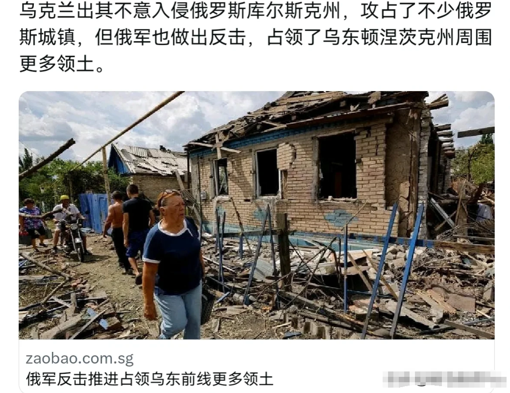 乌总统顾问波多利亚克周五说,入侵库尔斯克州是为了逼迫莫斯科启动公平和平谈判。另一个目标是建立缓冲区,防止俄军跨境空袭。但是,面对乌克兰的攻势,俄军也做出了反击,新加坡媒体说,俄军占领了乌东顿涅茨克州周围的更多领土。