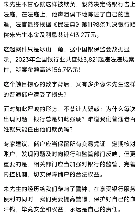 银行还真敢干啊!浙江一位男子存入400万定期存款,一年利息可达132000元。没曾想一年后取钱,银行竟说存款单是假的!朱先生怎么也没想到有朝一日会在自己身上应验。后来告上法庭,银行被判决赔偿其413.2万元。 几年前,他将多年打拼的心血——整整400万元存进了银行,本以为高枕无忧,谁知竟遭遇了一场惊心动魄的存款风波。自己的存单竟然成了假的!法官最终根据《民法典》第1198条判决银行赔偿朱先生本金及利息共计413.2万元。由此可见,银行犯罪成本几乎为0。至少也是员工个人行为,跟银行无关,该员工已被辞退,且该员工违法所得已用于赌博挥霍。 但是,需要明确的是,存款协议是和银行签还是和银行员工签?这应该很好区别,至于银行员工犯了什么事应该由银行或司法系统处罚与存款人何干?法院存单是真的。那否定存单真实性的银行应该承担什么法律责任?赌赢了白来400万,赌输了没损失,无本万利的生意,以后继续这么干,万一赢了呢。 满街贴告示,还有不识字,反复强调,鸡蛋不能放到同一个篮子里,你有1000万想存银行吃点利息,要分成20份,每份50万(银行破产法规定当银行破产时最多赔付50万)分别存在五个左右靠谱的银行,这样可以最大程度上避免因为大额存款引起银行硕鼠的贪心,而使路子用歪门邪道把你的钱骗到手,打官司又跟它耗不起。因为监管不力,因为银行非法侵占他人财务的时候法官只判银行归还本该属于储户自己的钱而没有加大罚款和给予储户应有的损失和赔偿。银行真的是该好好整顿了。