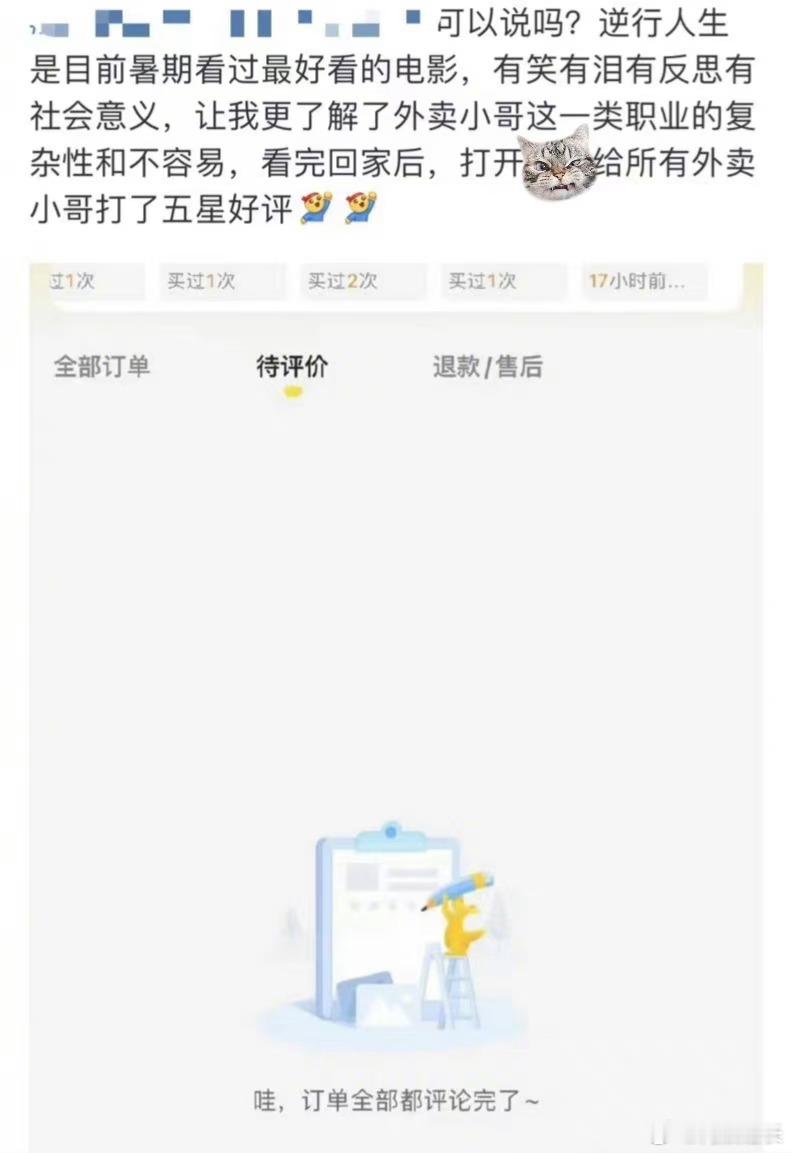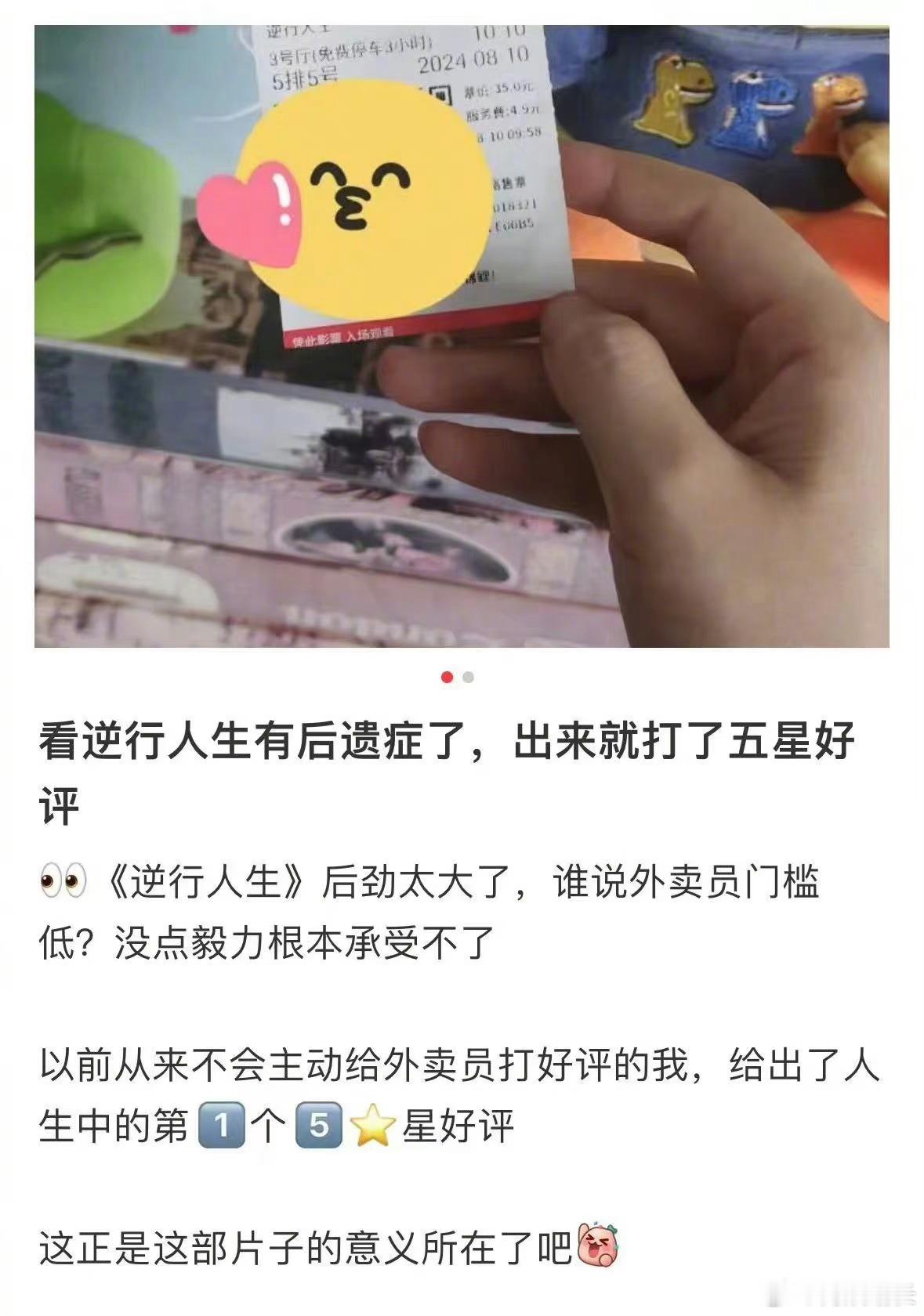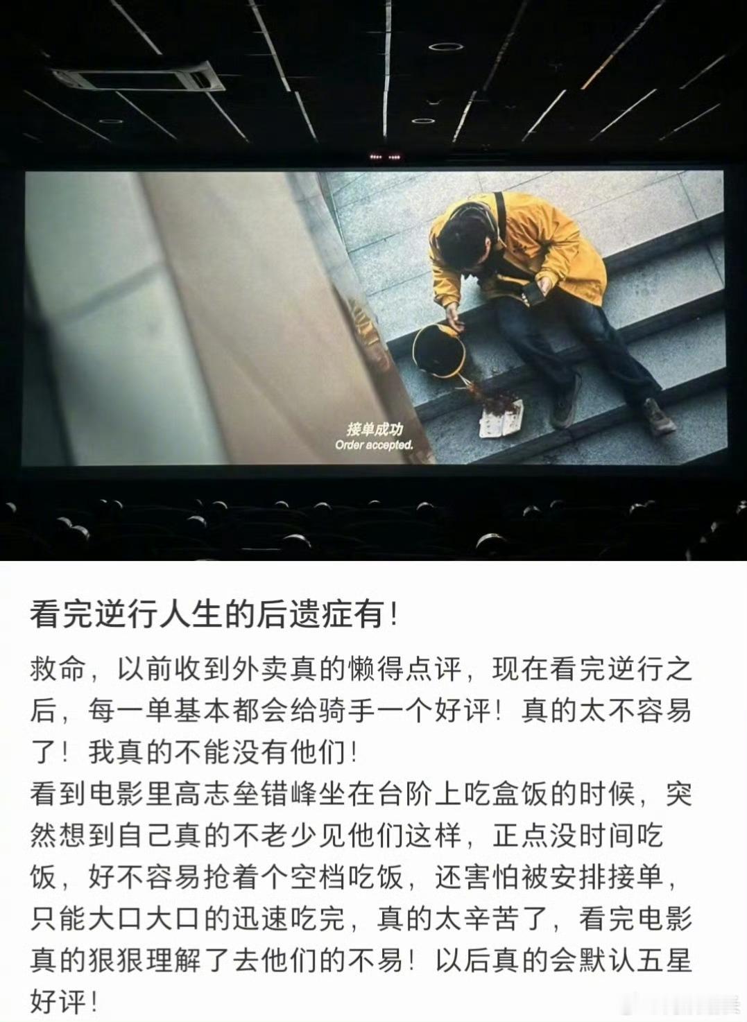 #骑手称最近好评变多#当电影《逆行人生》触动心灵,网约车司机开始理解骑手的辛苦。一句感谢,一瓶水,汇聚成人间温暖。在这个快节奏的时代,互相尊重让生活更有温度。愿更多现实主义佳作,续写理解与包容的篇章。