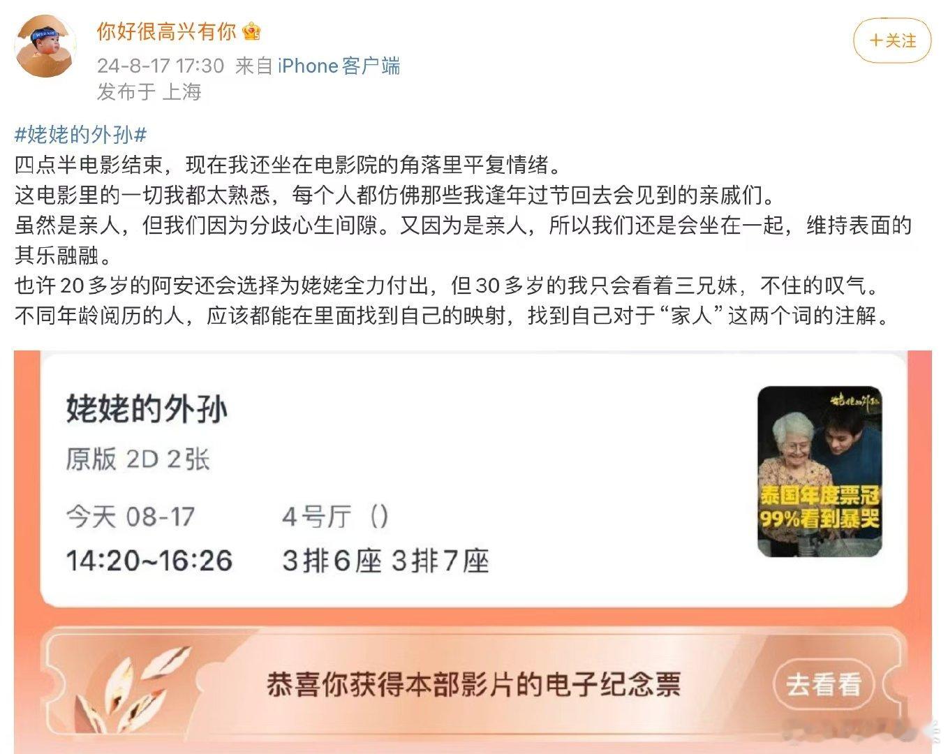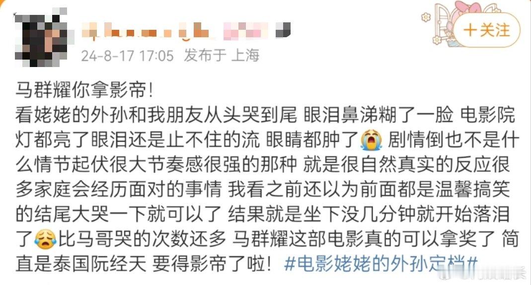 #姥姥的外孙点映口碑# 《姥姥的外孙》,一部让人心碎又治愈的电影。姥姥的默默付出,外孙的纯真可爱,仿佛就是我们生活的写照。电影中的每一个细节,都触动着我们的心灵。不要等到失去才懂得珍惜,让我们一起感受这份浓浓的亲情。