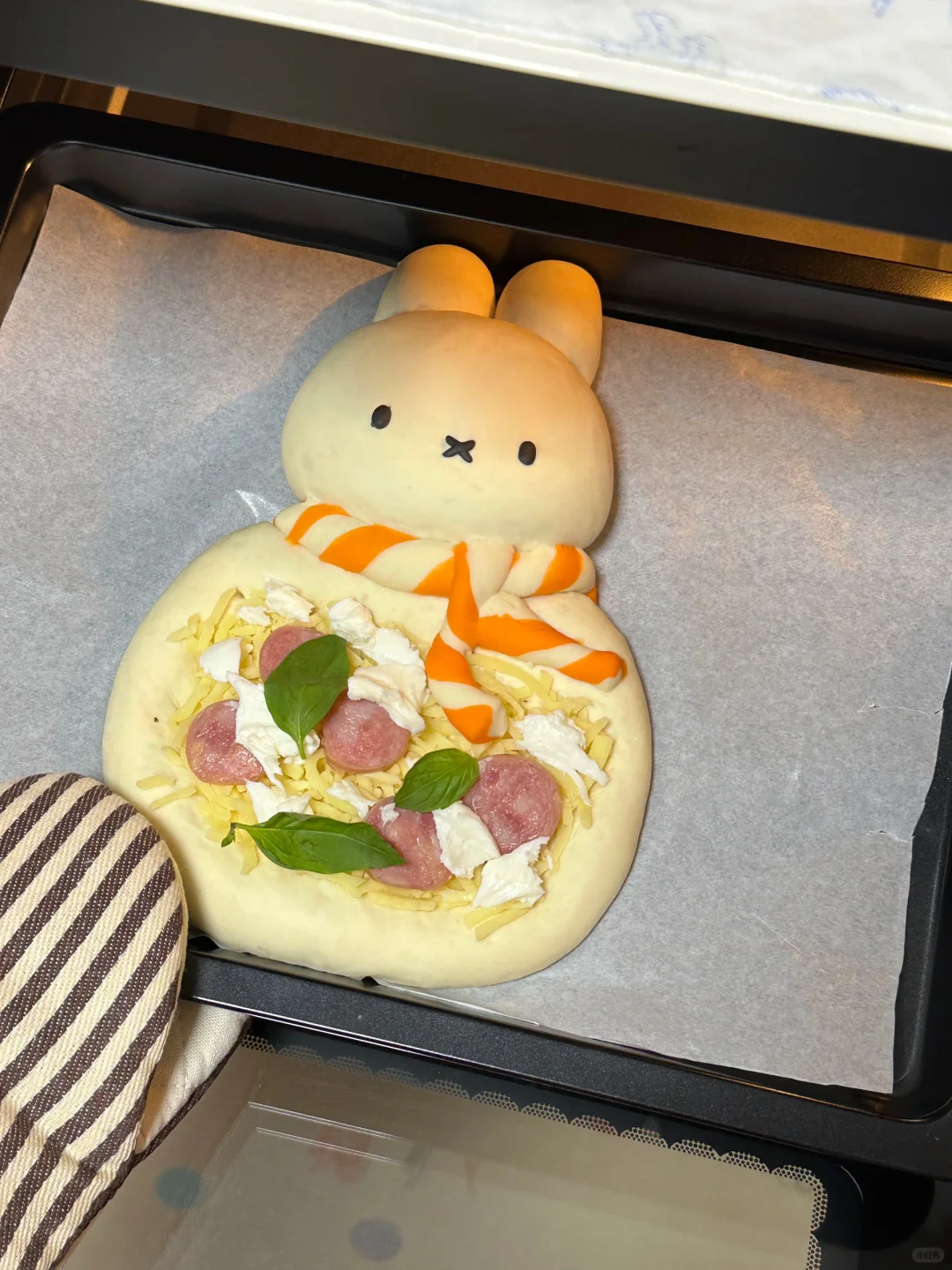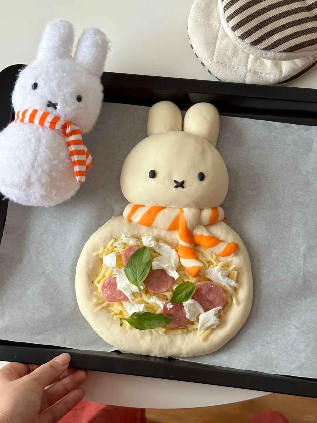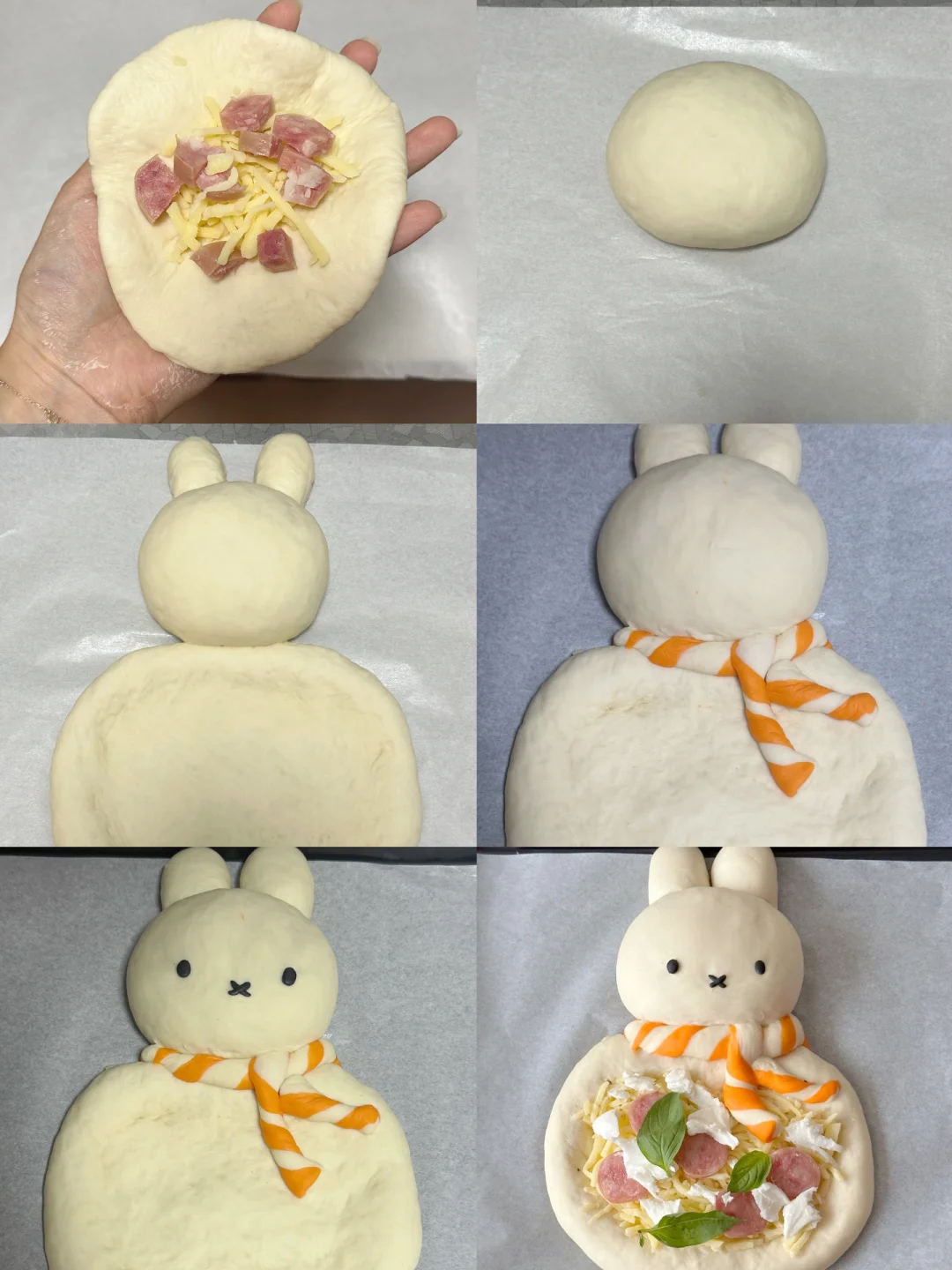 ⑤头和身子的比例1:3,取米菲头所需的面团揉匀擀平,包入喜欢的食材,收口朝下