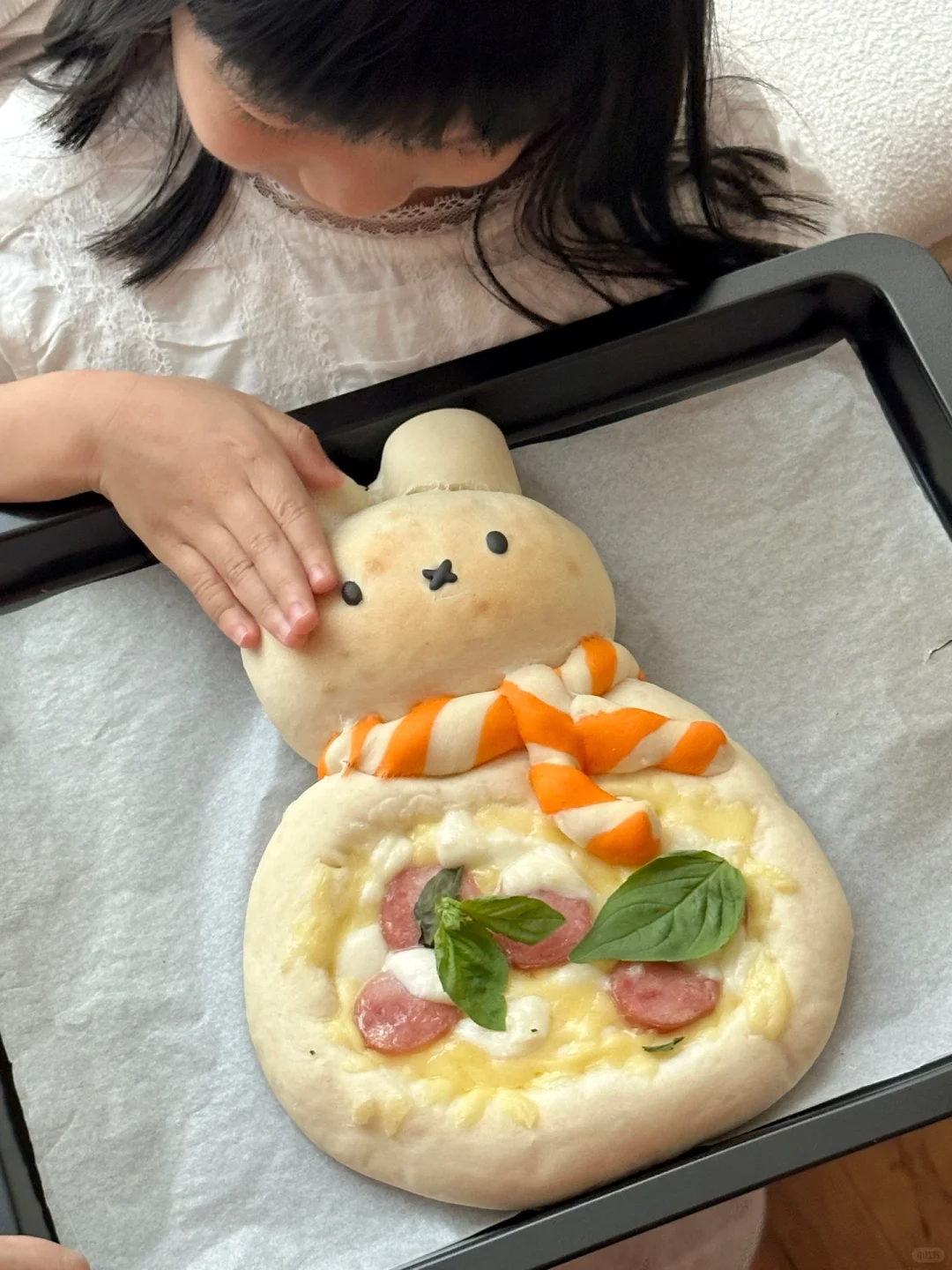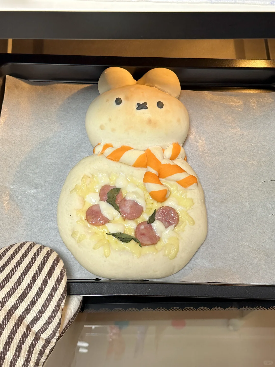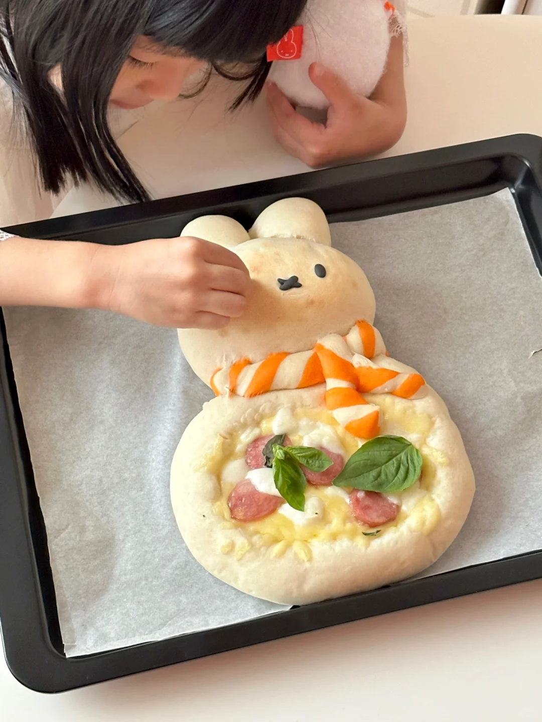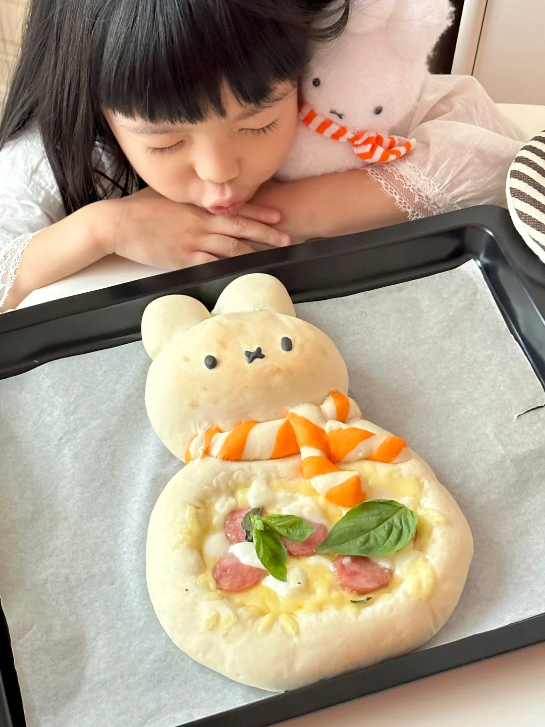 ⑤头和身子的比例1:3,取米菲头所需的面团揉匀擀平,包入喜欢的食材,收口朝下
