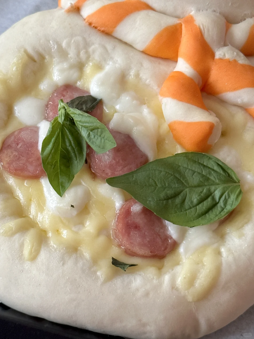 ④一小揪揪面团用黄金芝士粉上色(橙色),一丢丢面竹炭粉上色(黑色)