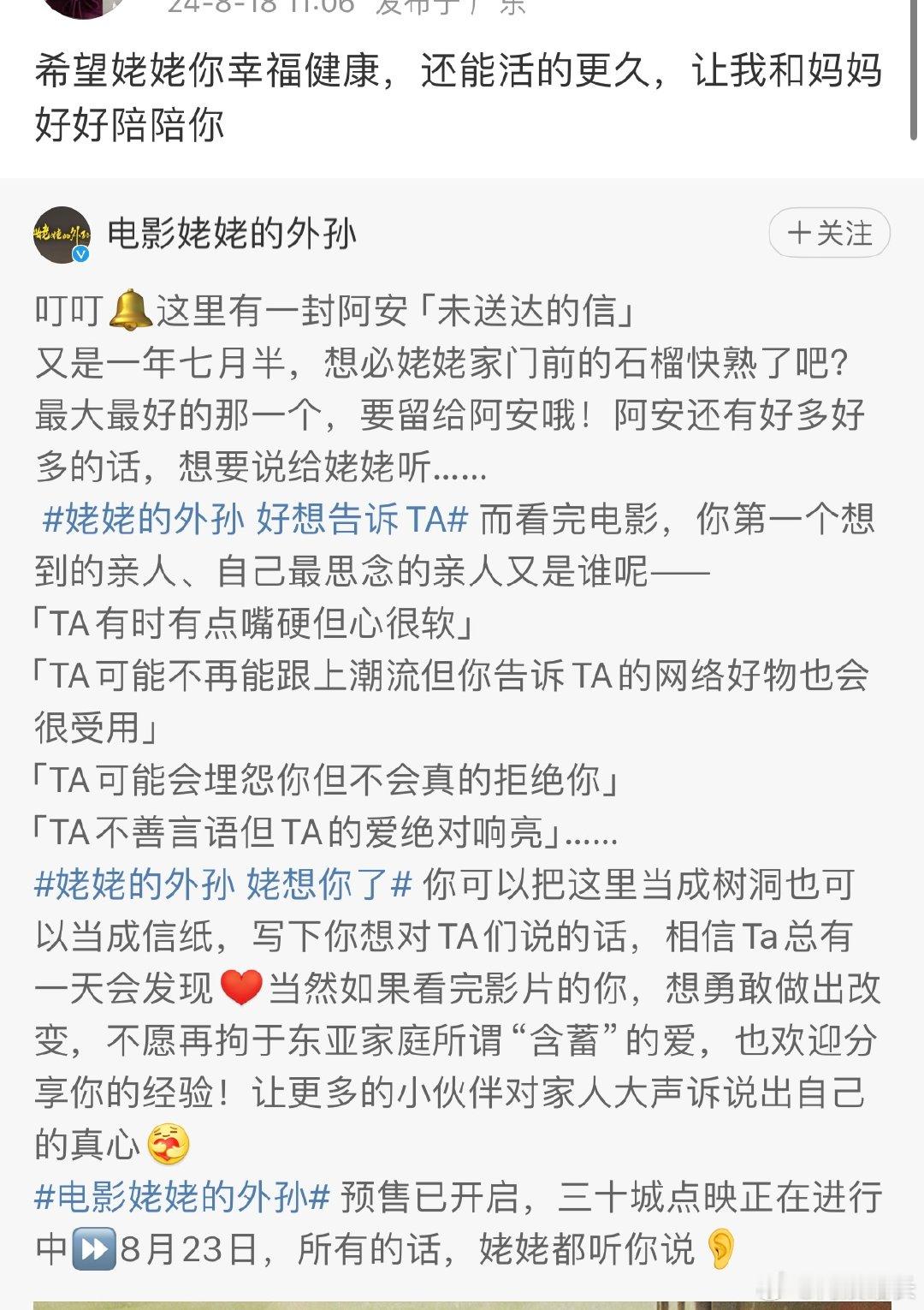 #突然就不害怕中元节了# 《姥姥的外孙》如同一束温暖的光,照亮中元节的思念之路。当亲人的爱跨越生死,恐惧便消散无踪。8 月 23 日,一起走进影院,感受这份深沉的亲情,期待与亲人在电影中重逢。