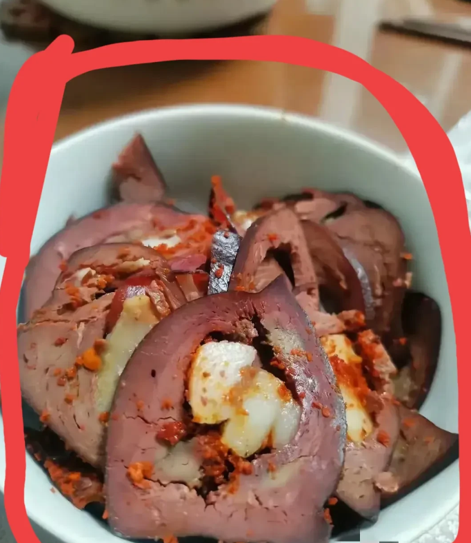 只见这道菜整体呈深红色,外观上看是一片一片的,最特别的是,它们的中间还夹着白色的不明物体,女子尝试吃了一口,感觉很劲道,特别好吃。