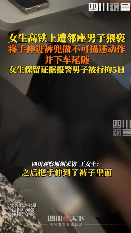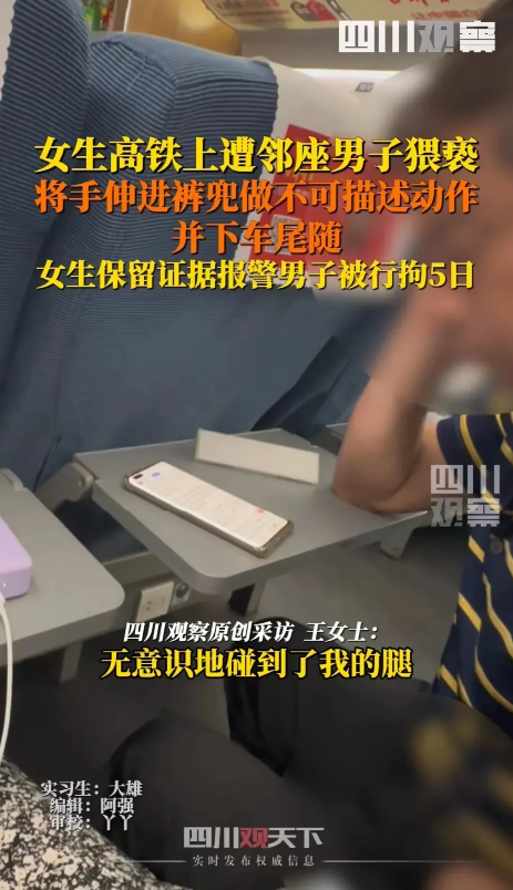上海,一女子坐高铁,旁边一男子假睡,有意无意的用腿碰触女子的大腿。随后,男子把手伸进自己的裤兜里,做起不可描述的事情。女生吓得花容失色,赶紧要求乘务员调换座位,结果男子向狗皮膏药一样跟了过去,下车后,男子还是粘着女子不放,女生果断报警,男子被刑拘5日。