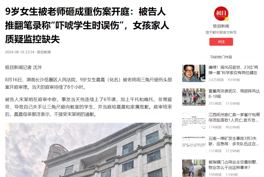 对此,你又是如何看待的呢? 信息来源:2024-08-16 23:34·极目新闻 9岁女生被老师砸成重伤案开庭:被告人推翻笔录称“吓唬学生时误伤”,女孩家人质疑监控缺失