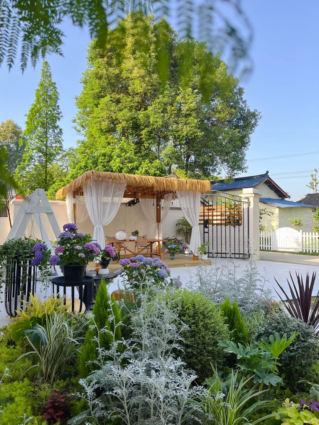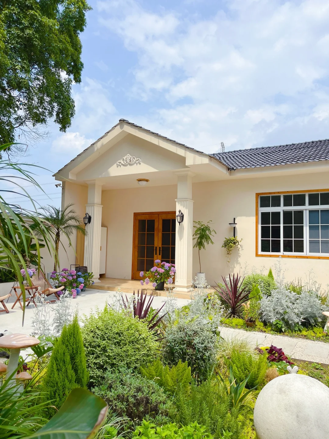 回农村自建房,入住快两年啦!一点也不后悔,房子四室一厅一厨一卫,刚好够我们一家五口住 当初院子建的比较大,花园➕凉亭的设计,让我们可以在院子里看电影🎬、聚餐,简直不要太香! 房顶用平顶现浇,再盖一层琉璃瓦的方式,让我家冬暖夏凉,想要自建房的宝子也可以参考我家[飞吻R][飞吻R]