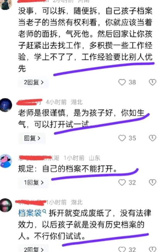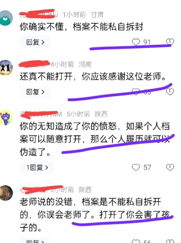 还有网友挖苦我太无知:“你是不作死就不会死,档案是不能私自拆封的,只有组织对组织,你要感谢老师才对,如果你私自拆开你儿子的档案,你儿子的一生都被你毁了”