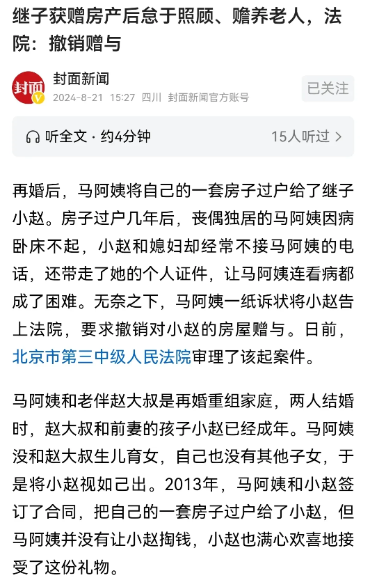 马大妈一纸诉状,将小赵告上法庭,要求撤销赠与,拿回属于自己的房子,用来给自己养老。