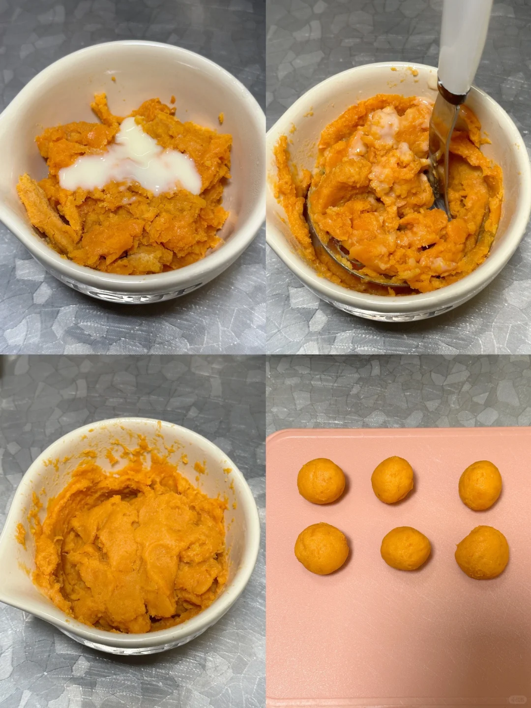 2️⃣烤熟的蜜薯去皮,加入一些炼乳,碾成蜜薯泥,团成10g一个的小球