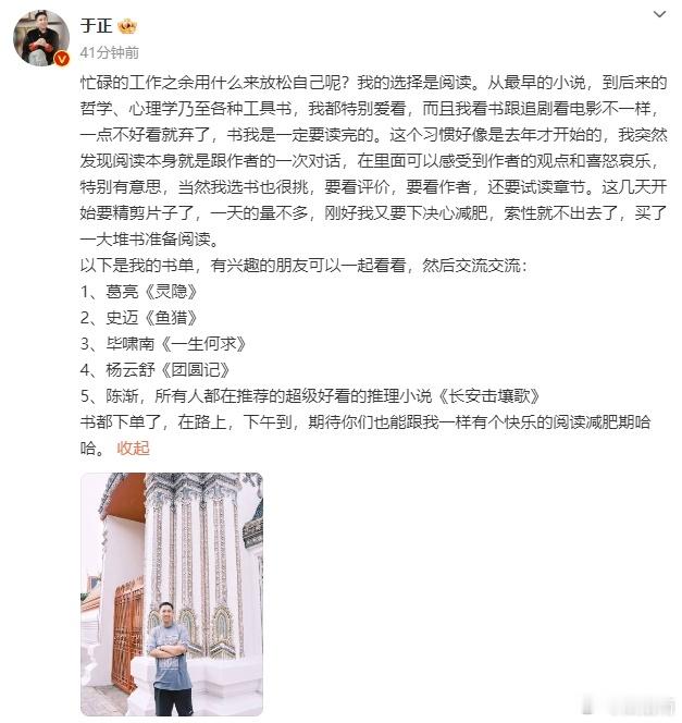 #于正晒书单##于正去年开始习惯读书# 于正的晒书单令人眼前一亮。从去年开始养成读书习惯,可见其对自我提升的追求。书籍是智慧的源泉,于正通过阅读不断汲取养分,为创作注入新的活力。这份书单不仅展现了他的个人喜好,也为大家提供了阅读的参考。期待于正在书籍的滋养下,继续为我们带来更多精彩的影视作品。