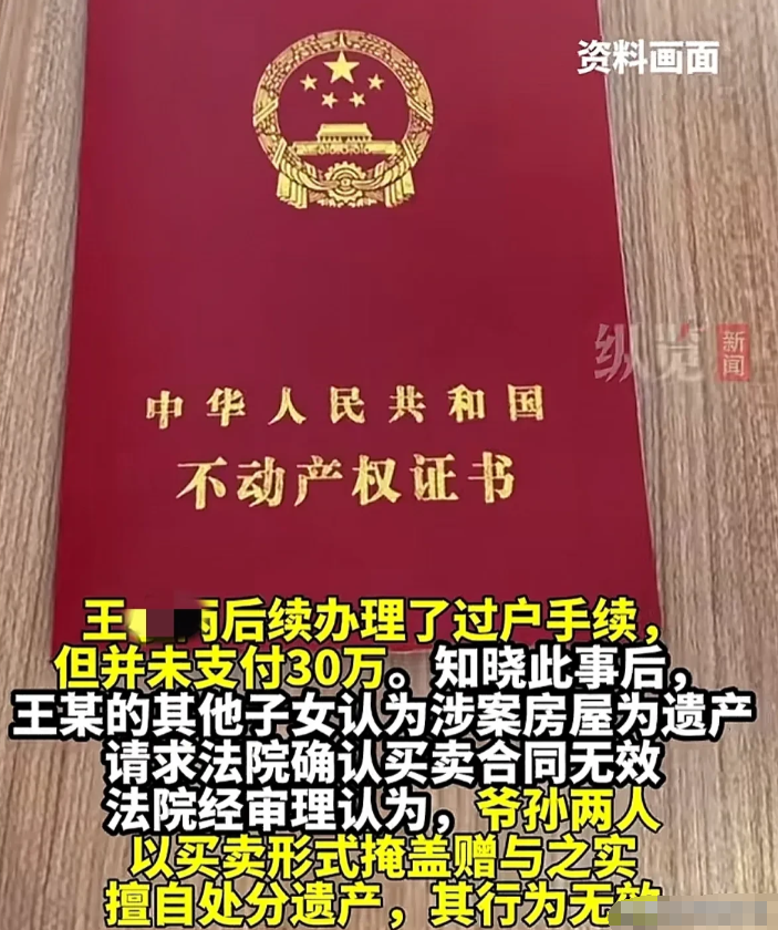 父母不公,儿女成仇!江苏无锡,大妈去世后,大爷瞒着子女,把自己和老伴的房产以买卖的形式过户给了孙子,说好30万房款,可孙子一分钱都没有给。子女们发现后,气坏了,认为这套房产有一半的产权属于母亲的遗产,他们姐弟4个都有份,父亲无权处分。子女们告上法庭,请求判定父亲和侄子的房屋买卖合同,法院判决亮了。
