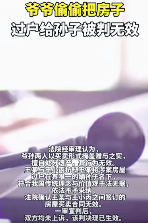 “别想白嫖!”江苏无锡,一老人妻子去世后,他瞒着自己的子女,私自和孙子签署了二手房买卖合同,孙子获得房子所有权后,并没有向老人支付30万元的房价,爷孙两人以买卖形式掩盖赠与事实,本以为能瞒天过海,不料,还是被家人发现,一怒之下把两人告上法庭,最后法院这样判了! 信息来源:大众网青岛《爷爷偷偷把房子过户给孙子被判无效》2024年8月28日 老王(化名)妻子去世后,他常常一人待在家里无所事事,每天枯燥无味的生活,让他一眼望不到尽头,好在自己的嫡长孙小明(化名)时不时来看望。 都说隔代亲,这句话可真不假,老王对小明那叫一个好,小时候给他买零食玩具,长大后便给他钱花,爷孙之间的感情让人动容。 这些好在子女看来无关痛痒,毕竟家里的子孙不多,小明听话懂事,还招人待见,但谁也没有想到老王竟然会瞒着他们,私自把房子过户给小明。 原来老王知道自己身体状况越来越不好,而房子和小明就是他唯一念想,子女虽然也是他最亲近的人,但他这套房子想给谁就给谁。 要是直接过户给小明,肯定还需要一大笔税收,为了避免小明多出一分钱,他决定将这套房子以市场价30万元卖给小明。 明面上是买卖房子,实际上就是赠送给小明,这30万元他才不会要,都这么大的年纪了,要这么多钱有什么用。 小明深知老王对他的良苦用心,所以他没有把这件事情告诉任何人,即使是他的父母。 等到老王把房子过户成功后,就算他的子女得知了这件事情,在他这里胡搅蛮缠,也没有任何作用,小明到时候就成为了这套房子的新户主。 所有手续都办妥后,小明终于拿到了梦寐以求的房产证,老王看着开怀大笑的小明,内心充满了喜悦,但这件事情并没有那么容易结束。 老王的子女不知道从什么渠道发现了这件事情,他们顿时怒不可遏,除了小明的父母外,其他人都跑到老王跟前讨要说法。 在老王看来,妻子离世,这套房子的所有权就全部归自己所管,他想怎么处理,还轮不到子女管教,木已成舟,再胡闹也改变不了事实。 其他子女一怒之下将老王和小明告上了法庭,要求法官撤回两人的买卖合同,给出的理由是他们也享有这套房子的继承权。 这套房子是老王夫妇的共同财产,老伴去世后,她的子女、配偶都享有继承权,所以这套房子从严格意义上来讲,属于子女和老王的共同财产。 老王将房子售卖给小明时,没有征求其他继承人的意见,这本就不符合常理,子女有权利撤回买卖合同。 虽然房产证上写的是老王的名字,但这不是他侵犯其他子女权利的缘由,况且合同上标注的30万元,小明实际上并没有支付。 爷孙两人的恶意串通让他们实在没有办法忍受,老王在法庭上强词夺理,但终究逃不过法律的约束。 经过法院审查,最终判决售房合同无效,子女和老王都属于这套房子的继承人,双方对于这个结果没有异议。 对于这件事情,大家有什么看法?