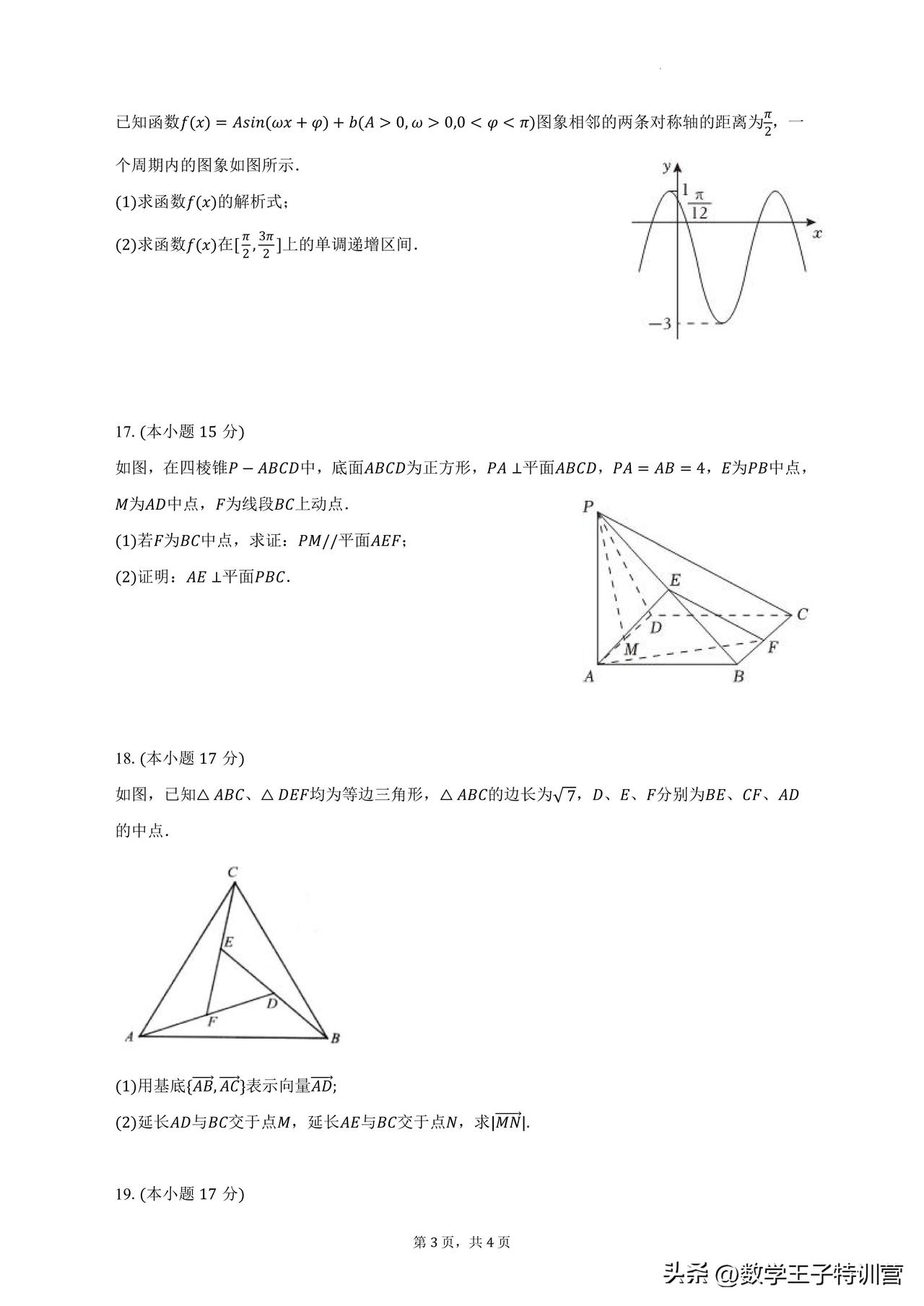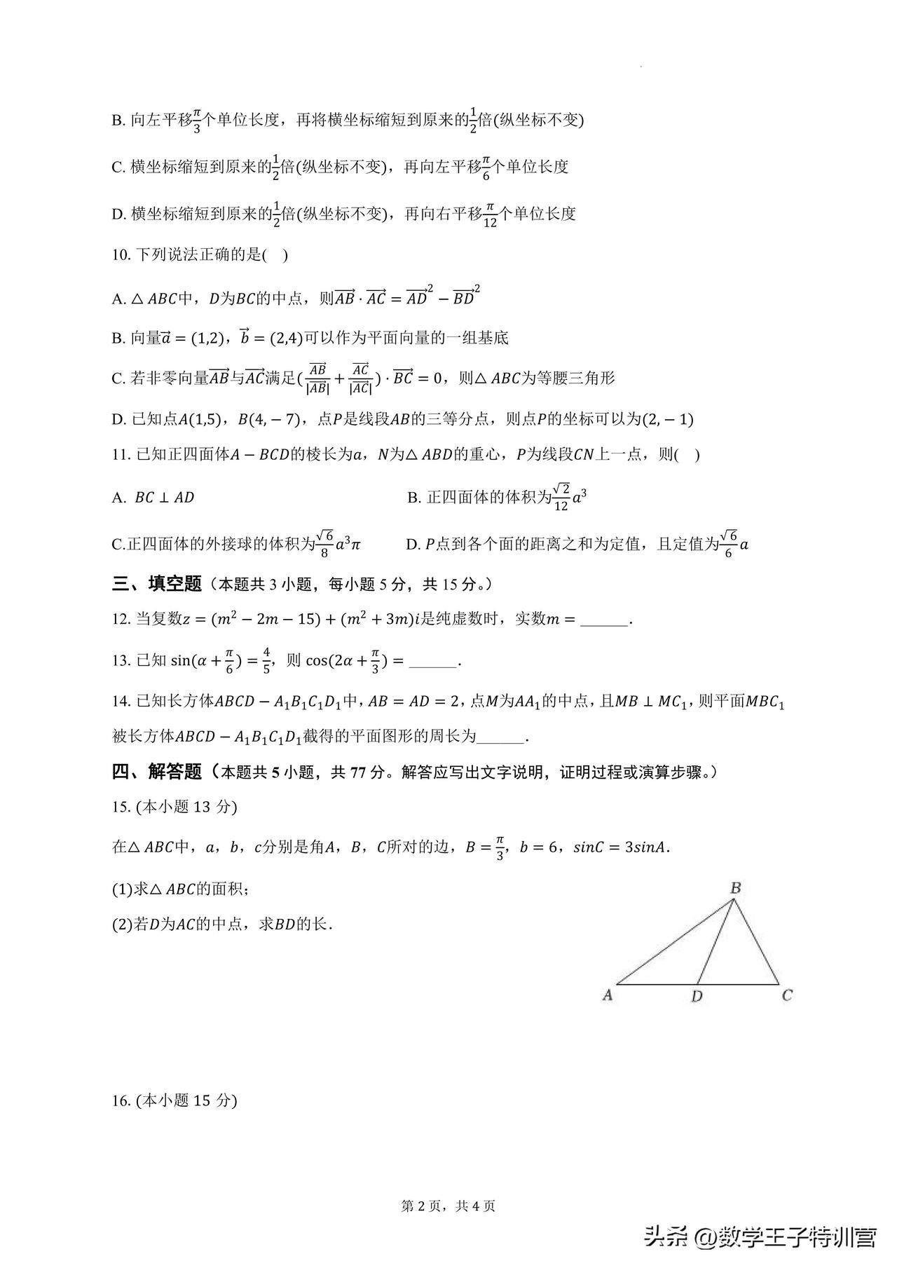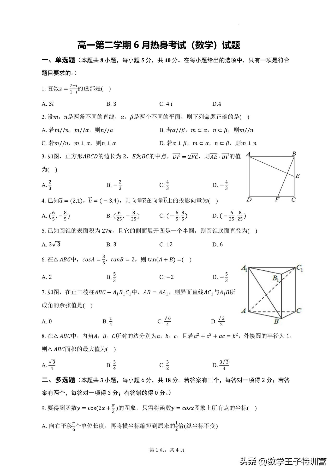 高一数学必修第二册期末考试,应该重点复习哪些内容? 以广东江门为例,考试范围为必修第一册第5章三角函数到必修第二册第8章立体几何。统计和概率今年不在期末考试范围。3年3个样,一直都在变。 首先,三角函数是一定要重点复习的。这个原因也不用多说。 但想强调的一点是,2024年新高考1卷,三角函数考了23分,两道单选题,分别为第4题和第7题;1道解答题,第15题13分。共计23分,这个分值还是比较多的,占总分的15.3%。 而且三角函数相隔时间也比较久,很多同学连基本的公式都忘干净了。 这个学期期末考试估计三角函数占分起码30分以上,因为考查内容就4个章节,三角函数又如此重要。化简求值、三角函数的图形与性质,单选+多选,解三角形1道跑不掉的,至少13分。 其次,立体几何也是这个学期的重点和难点,值得你花十二分的力气来复习。 2024年新高考1卷,立体几何考查了20分,1道单选题,单选第5题,求圆锥的体积,算是送分题;1道15分的解答题,第17题,第3个解答题。 这个学期立体几何首当其冲是第一个大重点,如果从备考的角度来看,他应该和三角函数并列第一。 基本概念、基本公式、判定定理和性质定理,都要记得滚瓜烂熟,掌握到位。 常考题型也应该多加练习,像线面垂直、面面垂直的证明,线线角、线面角以及二面角的计算,还有距离的求法,都要多加练习。 再次,平面向量也需要花点时间复习掌握,相对来说比较简单,因为把解三角形放在三角函数那里了。但需要重视的内容有向量的数量积、向量的极化恒等式、奔驰定理、等和线、三角形四心表示。 最后,复数送分题。两道题可能还是会有的。没有难度,认真细心就好。 结合以上分析,备考就知道在哪些地方多下功夫练习了。 发现问题、解决问题、强化知识体系,优化解题方法。 归纳总结,让学过的知识像一串葡萄一样,能够清晰地展现在眼前。#高中数学##高一数学##期末考试#