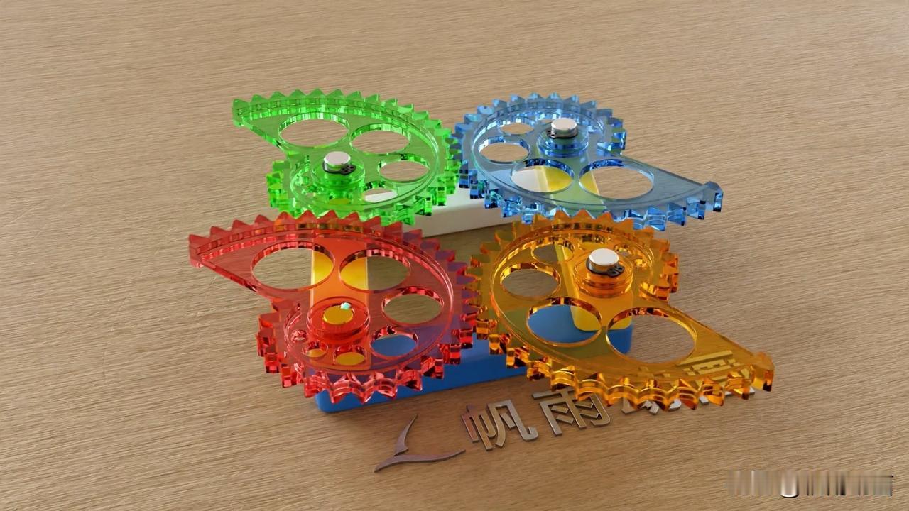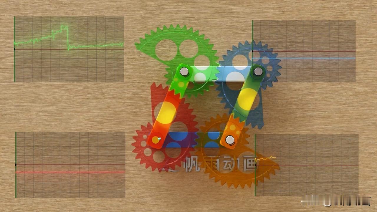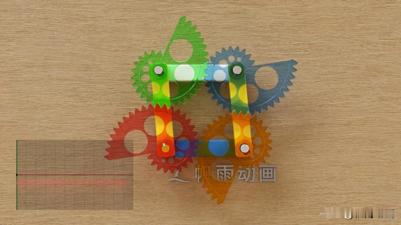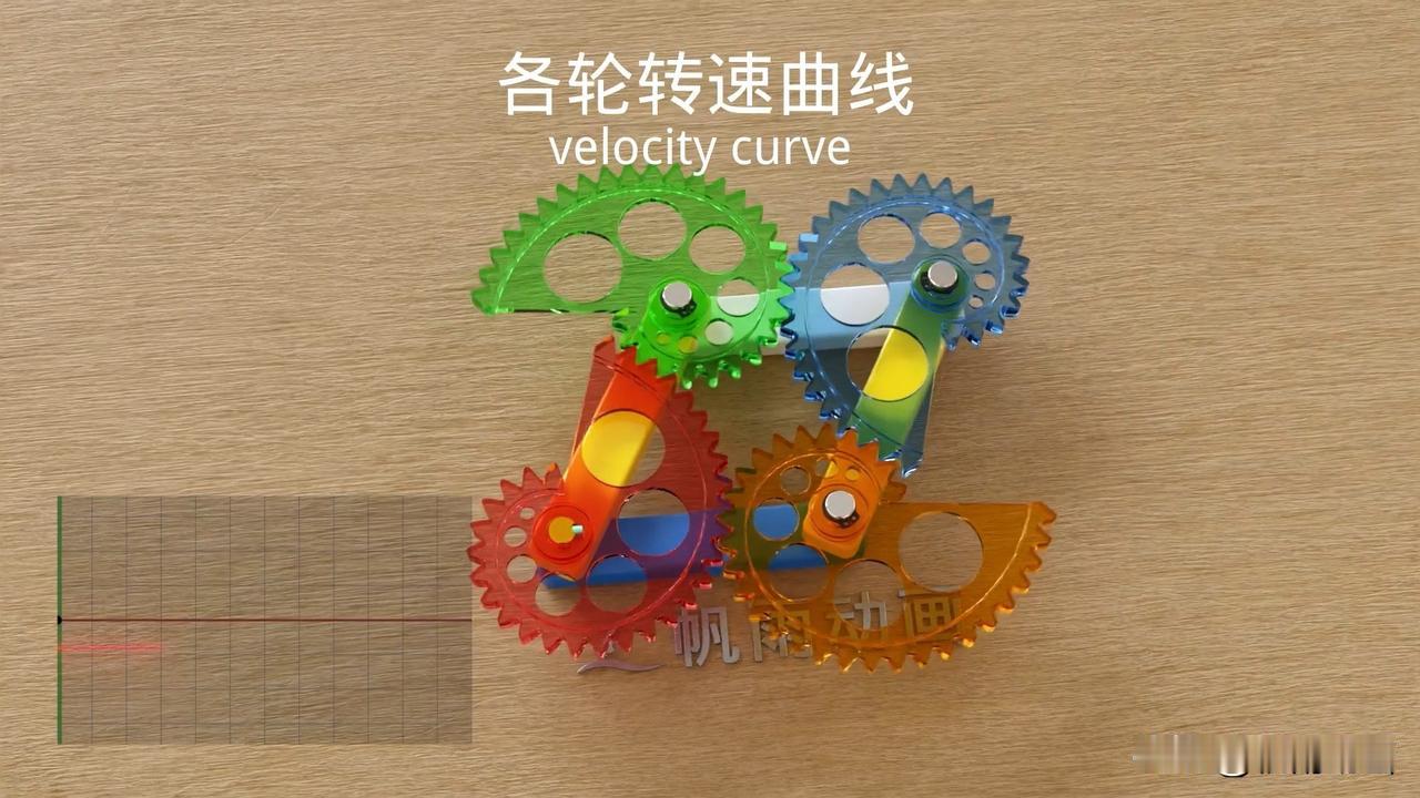 附图中为四个鹦鹉螺齿轮,它们通过连杆连接在一起。 其中蓝色的杆件是机架,也就是说它静止不动,两黄色杆件长度相等,而白色杆件和蓝色杆件长度相等。四个杆件组成一个平行四边形。 红色齿轮为主动轮,在大脑中运算,推测出它们的运动方式。 附图中有四个齿轮的速度曲线作为参考。#机械设计# 机械设计零件与实用装置图册 机械工业
