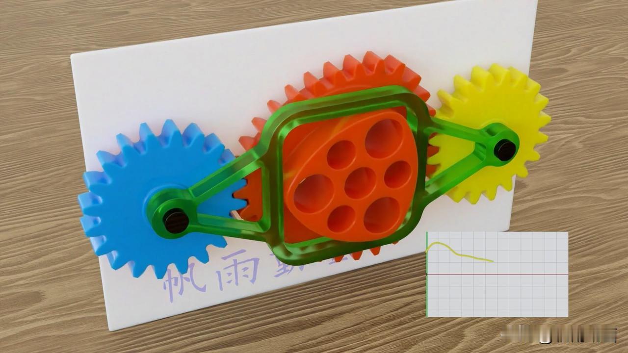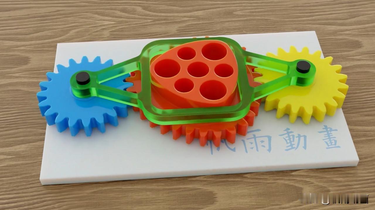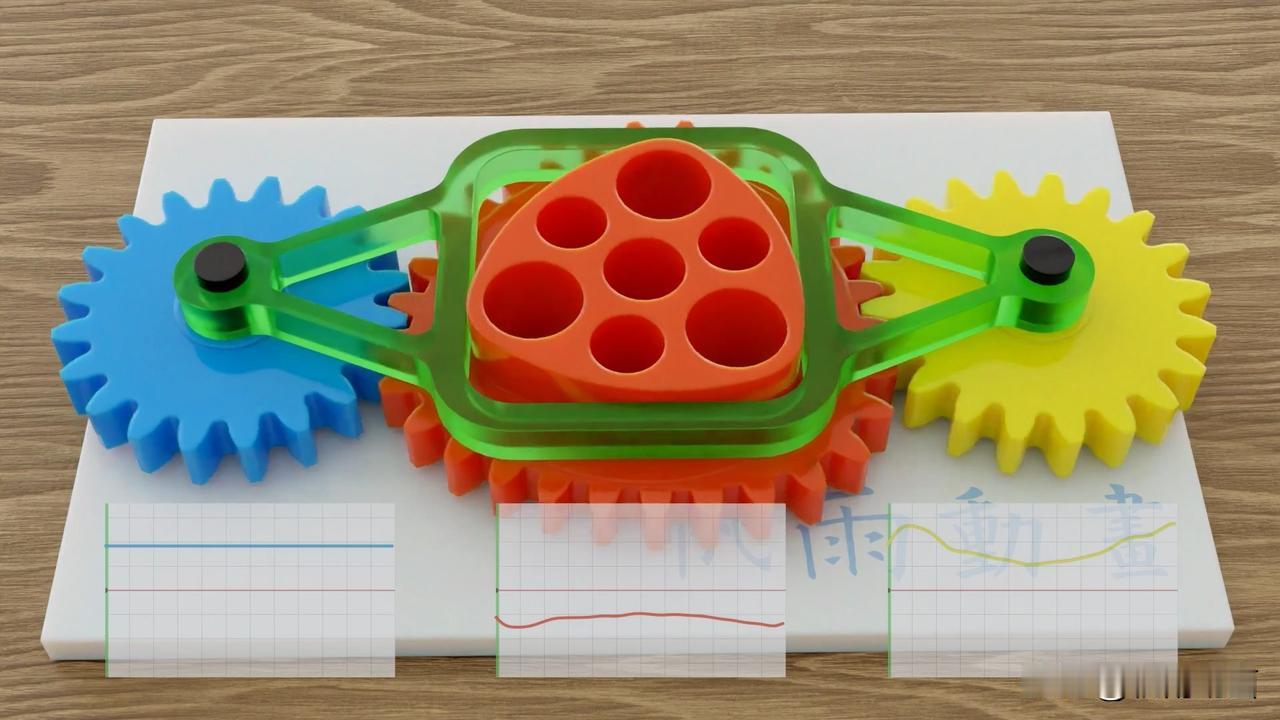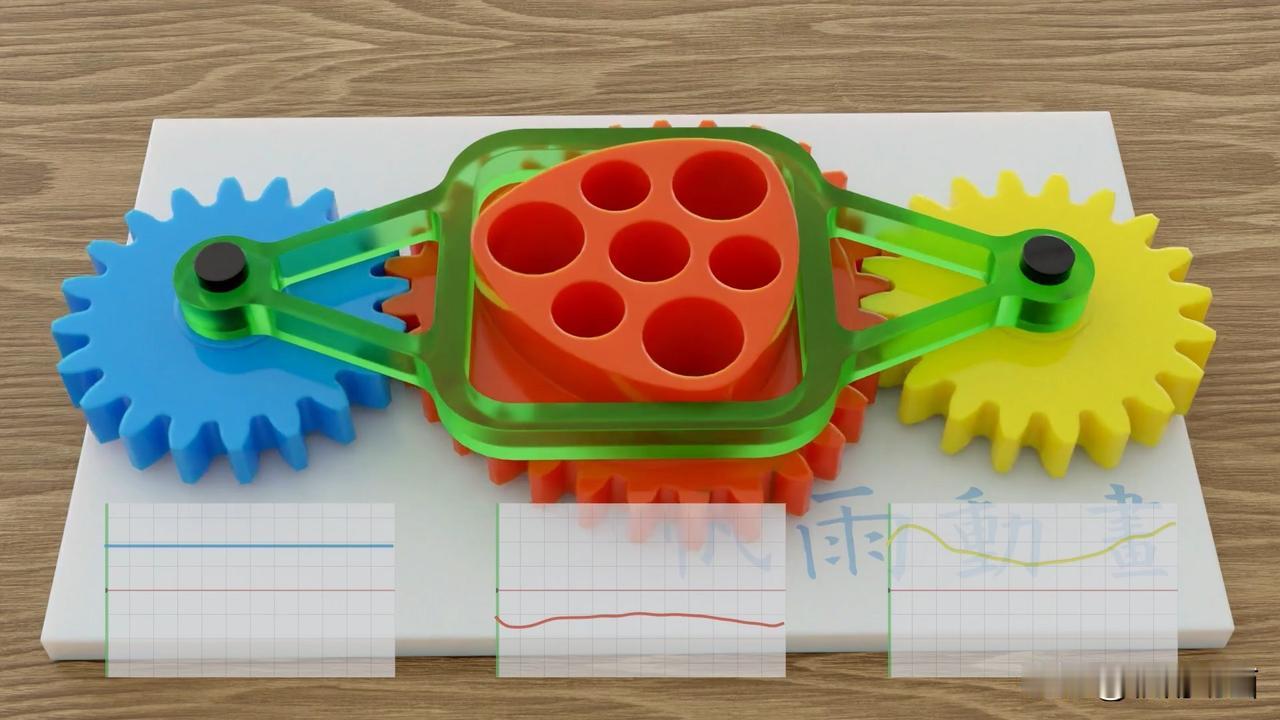 这是莱勒三角齿轮传动机构,两个齿轮通过一个非圆齿轮,这里是莱勒三角形齿轮,来传动。 虽然两个圆形齿轮的中心是固定的,也就是它们的中心距不变,但莱勒三角形是一种等宽图形,因而能够在其中传动。 图中蓝色齿轮是主动轮,因而它的速度曲线是一条直线。而黄色齿轮的速度曲线不是直线,可知它的速度是变化的。#机械设计##机械原理# 机械零件与实用装置图册
