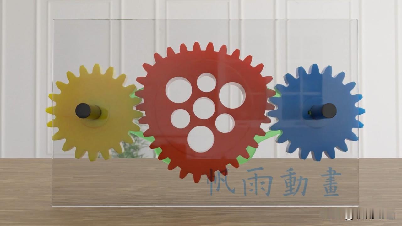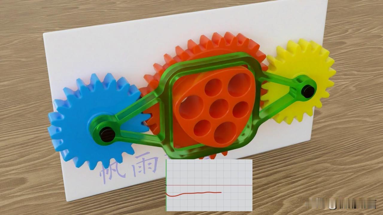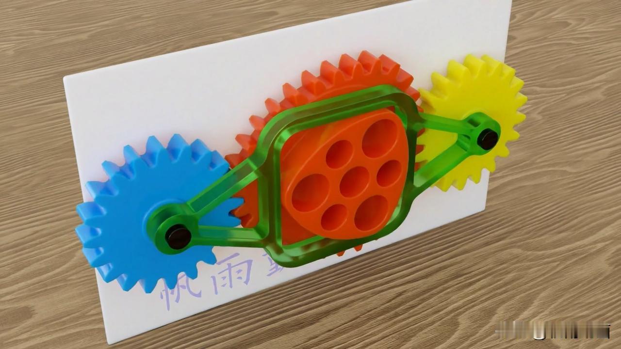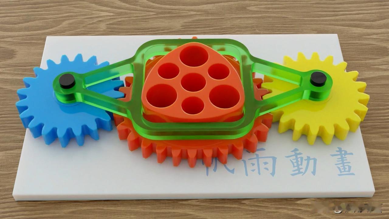 这是莱勒三角齿轮传动机构,两个齿轮通过一个非圆齿轮,这里是莱勒三角形齿轮,来传动。 虽然两个圆形齿轮的中心是固定的,也就是它们的中心距不变,但莱勒三角形是一种等宽图形,因而能够在其中传动。 图中蓝色齿轮是主动轮,因而它的速度曲线是一条直线。而黄色齿轮的速度曲线不是直线,可知它的速度是变化的。#机械设计##机械原理# 机械零件与实用装置图册