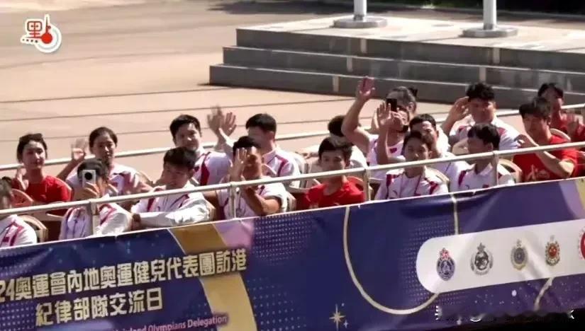 这个文案也挺逗的,30多度的高温,大家坐着没顶的双层巴士就这么来了,难怪莎莎和大头笑得好开心[捂脸] 今天奥运冠军们兵分几路出去啦!莎莎和大头一组,坐着有空调的车去体育学院交流,还可以玩健身器材 小胖和龙队还有其他运动员去了纪律部队交流,队里,在30多度的香港,穿着外套,坐着没有顶的双层巴士,晒着去的[偷笑] 这么大太阳,小胖又要不停出汗了[捂脸]