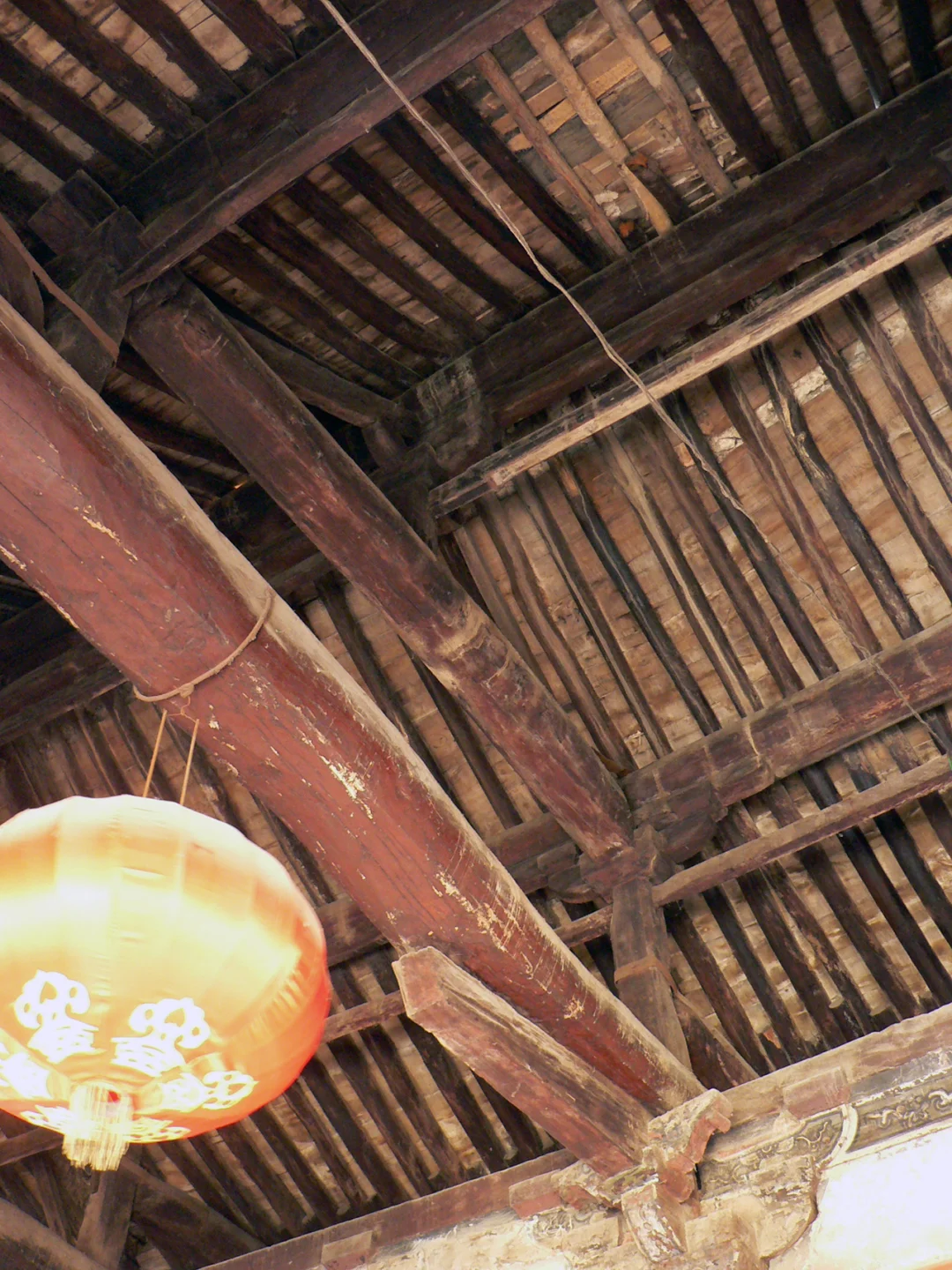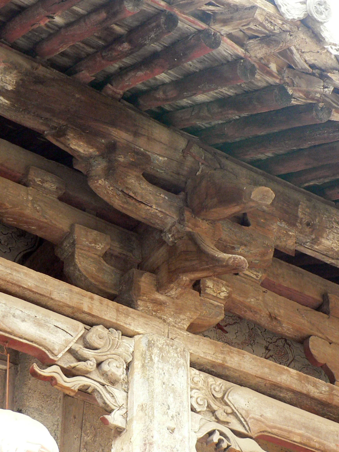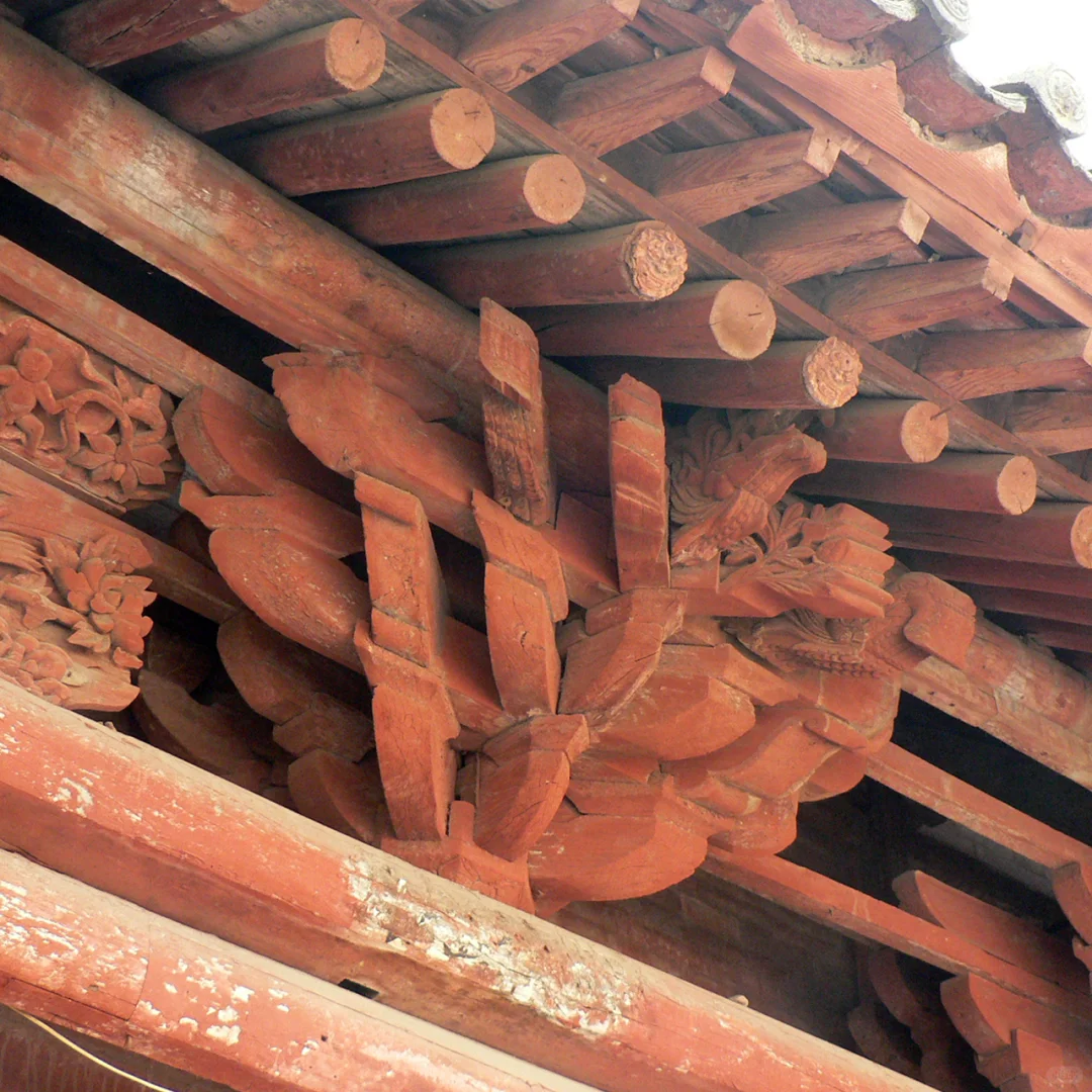 [自拍R]其中正殿为元代建筑,面阔五间,六架椽屋四椽栿对乳栿用三柱,前檐的柱、额似乎都是清代更换,还在四椽栿下增加一排柱子隔出前廊,殿内用减柱造,减去次间两根内柱,次间和梢间共用一根大额承次间屋架,明间施绰幕枋承托两侧大额,视觉上明间形成一个低矮狭窄的龛室空间,次间梢间反倒是粗大内额支撑的高敞空间。