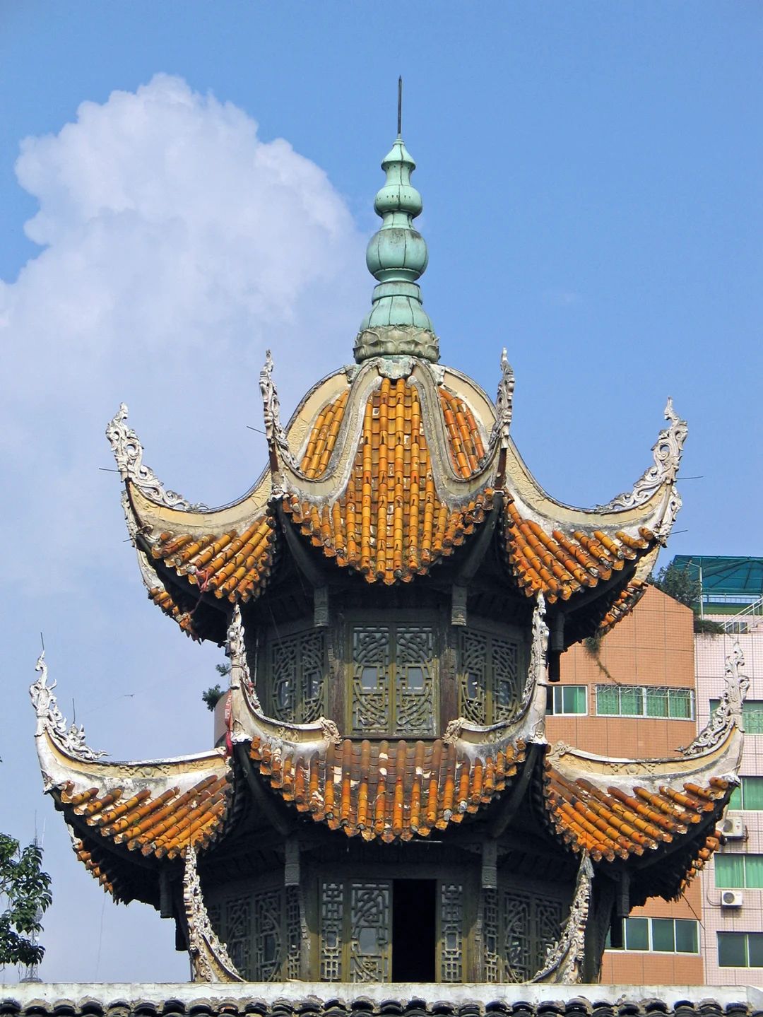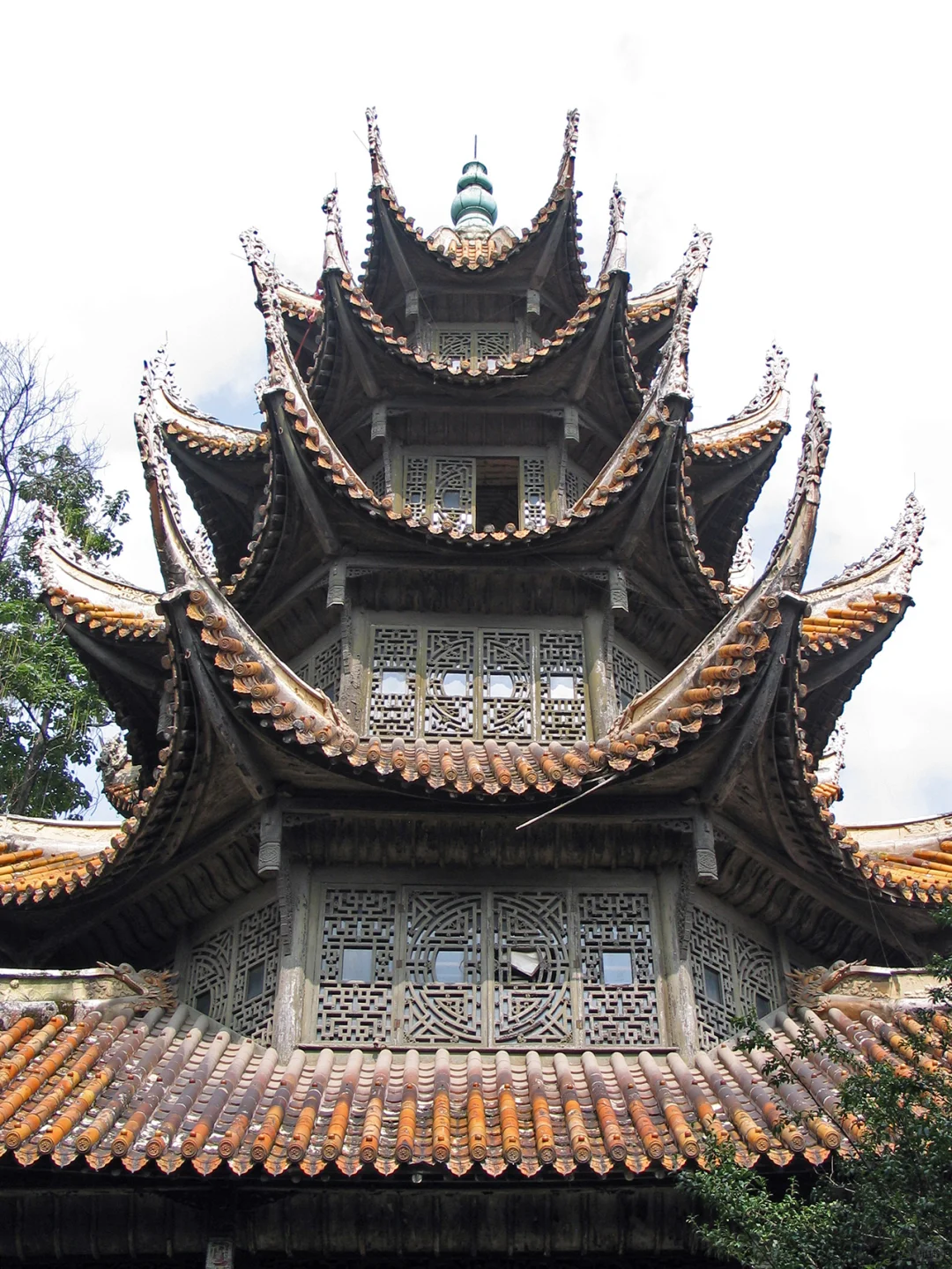 [自拍R]大觉精舍倚贵阳东城墙而建,标志性建筑是一座五层楼阁,原藏有一套影印碛砂藏,楼阁首层方形,上四层八角形,飞檐翘角,盔顶攒尖。从西侧的文笔街贵州省工委旧址门前路过时,远远就能望见这座高耸的楼阁。