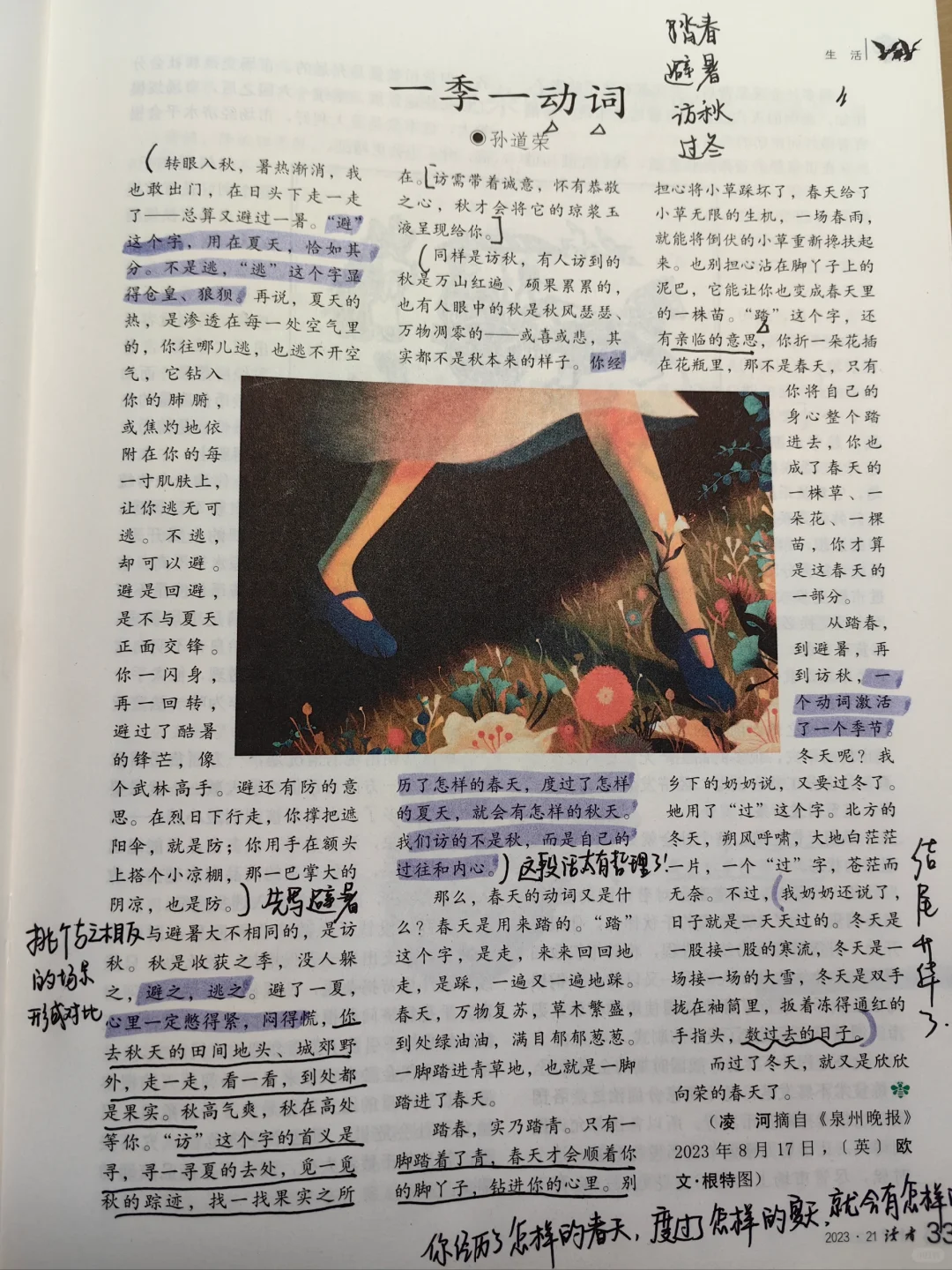 我们常说,踏春,避暑,访秋,过冬,但是没有从动词的角度切入去写文章。就拿文章中的“避暑”来说,作者说:避这个字,用在夏天,恰如其分。不是逃。逃这个字显得仓皇,狼狈,避是回避,是不与夏天正面交锋。这么一赏析,是不是很有味道[偷笑R][偷笑R][偷笑R]~