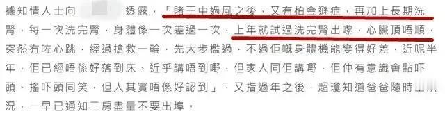 2009年,88岁的赌王在摔倒后一病不起,医院判定他的各脏器早已衰竭,生命垂危。可赌王最终却多活了11年,直到2020年才去世,这中间究竟发生了什么? 自从赌王2009年摔倒撞伤头部后,网上时不时就传出他病危的消息。 因为这些年来,他的各种器官都陆续衰竭,成为ICU的“常驻嘉宾”。 他有严重的肾衰竭,需要长期洗肾,但每洗一次,身体就会变得更差。有一次洗肾后,甚至出现了心脏停跳的症状。 又因为中过风,还患有帕金森,他后期几乎丧失了行动和交流能力,听到家人说话只会点头摇头,也已经认不出人。 按理说,拖着这样一副油尽灯枯的身体,多活十年并不现实。 但赌王不是一般人,他续命的秘密,藏在了他的“钞能力”中。 港媒曾经报道,赌王住的两间VIP独立病房,装修华丽如同别墅,完美兼具疗养和家居功能,就连陪住的家属都有私人坐厕和浴室,一天的费用高达86万港币。 不仅如此,病房还配备了一整套的医疗设备,价值2000万港币。 家人又花重金为他请来一众顶尖名医,脑心肝脾肺肾面面俱到,还有7人以上的高级护理团队24小时待命。 除此外,赌王依靠天价药保命,80多万一针的补脑针从不间断。 据统计,赌王从2009年患病到去世,11年间总共花费了15亿港币的治疗费用。 这个天价金额,是普通人难以想象的。 而这对于坐拥5000亿家产的赌王来说,只是撒些毛毛雨而已。 赌王出生在香港的一个富豪家族,20岁因为家道中落,揣着10块钱到澳门逃难。 因为求娶到当地的名门千金黎婉华,赌王在岳父家的助力下成功发家,仅用1年就成为澳门最年轻的百万富翁。 后来,赌王的事业越做越大,澳门有三分之一的人都在为他打工,用他自己的话说就是:“他不可能穷的,公司每天都像印钞票一样。” 2020年,赌王去世后,他留下的巨额遗产和续命花费的天价医药费无一不让外界震撼。 靠砸钱硬生生延寿11年,果真应了那句“有钱能使鬼推磨”。