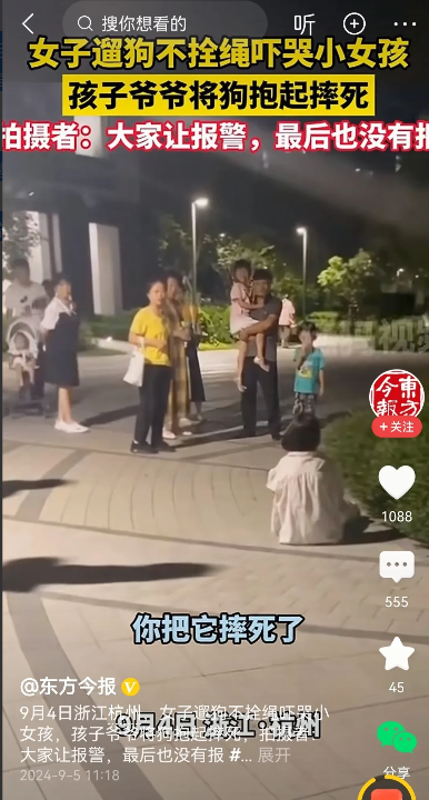 据现场知情人士表示,小女孩是老人的孙女,老人看到小女孩被狗追后,情绪比较激动,所以直接摔死了小狗,但实际上,小狗并未咬到小女孩。