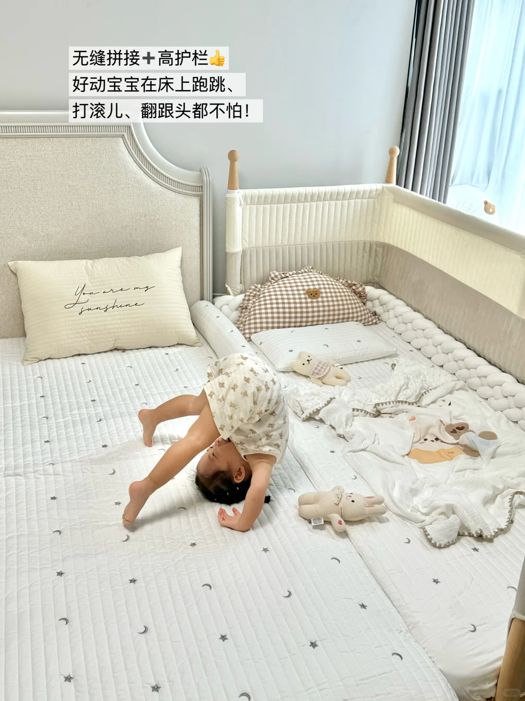 拼在一起完全感觉不出缝隙,秒变3米大通铺!宝宝在上面蹦跳打滚儿不会卡手卡脚。晚上喂奶哄睡躺在交界处也不硌,舒适度直接拉满!对宝宝和妈妈都很友好~