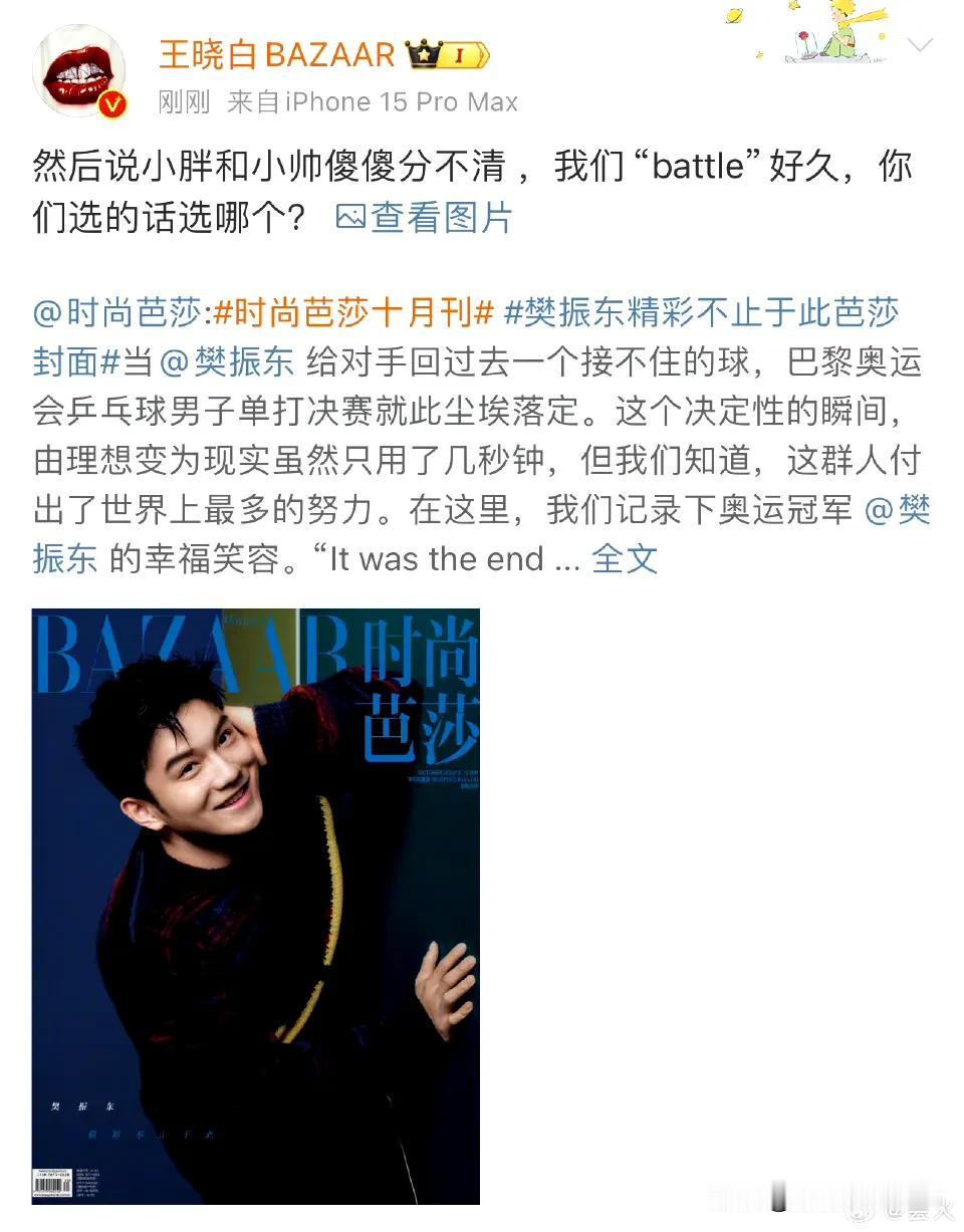 我也觉得樊振东自己选的封面好看,水瓶座是知道自己什么时候最帅的[捂脸] 好想知道这些照片是怎么拍出来的,会不会害羞,还有花季的年龄谁穿衬衣呀!这不还是穿了[捂脸] 这些衣服都不太好看,全靠小胖的脸撑着[大笑]