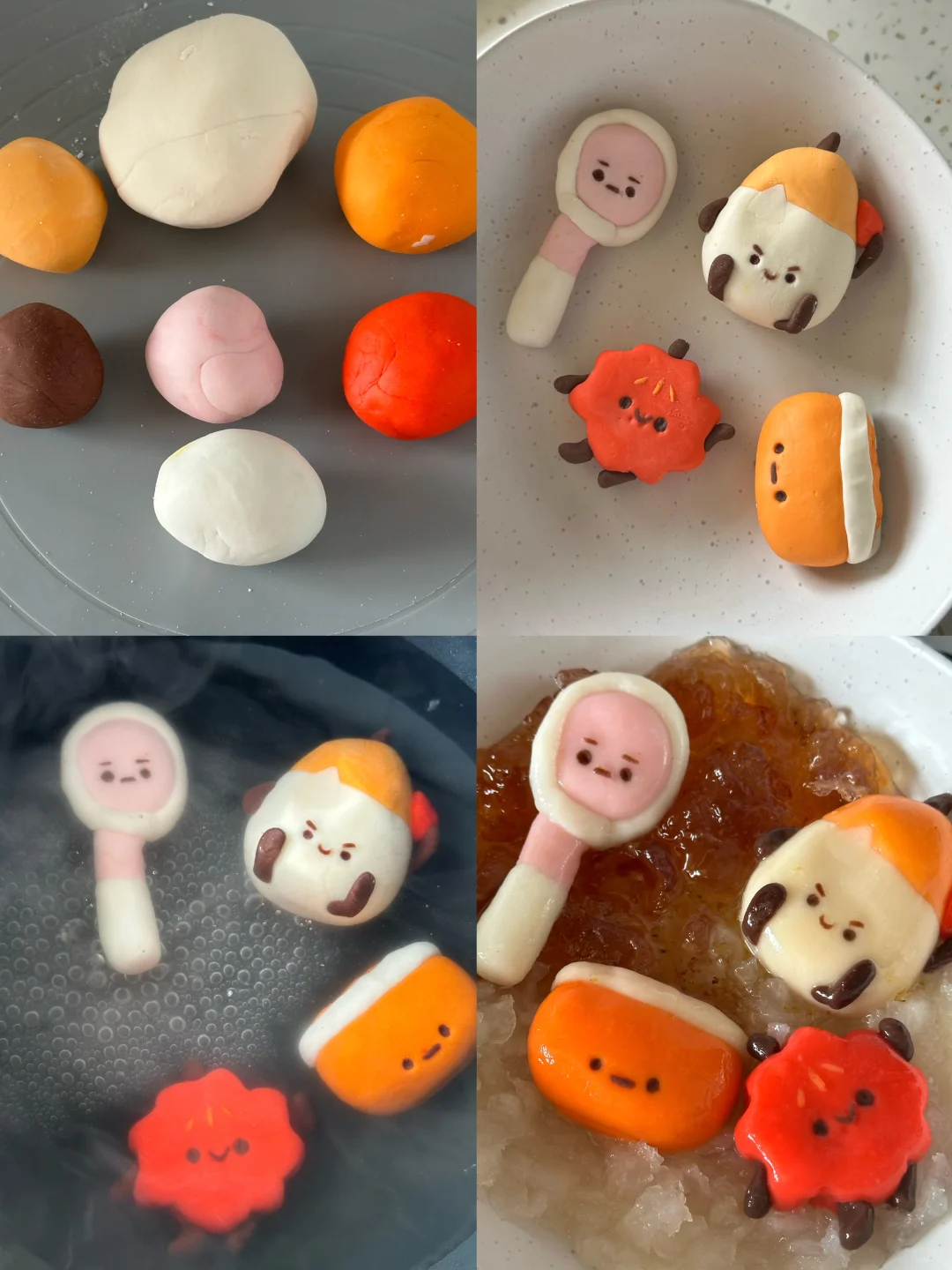 2.汤圆配料混合均匀,揉成团,分份调色,做出玩偶们的形象,水开下锅煮至稳定漂浮