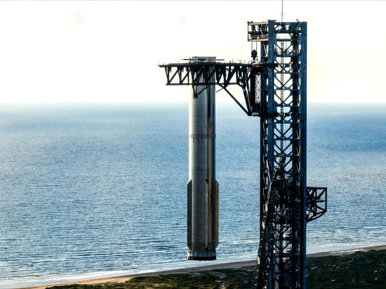 SpaceX使用星舰发射塔架“筷子”将超重型火箭(b12)夹至回收高度,进行回收