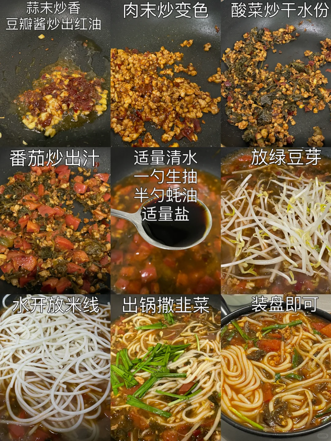 1️⃣蒜末炒香豆瓣酱炒出红油,加肉末炒变色。酸菜炒干水分,番茄炒出汁。