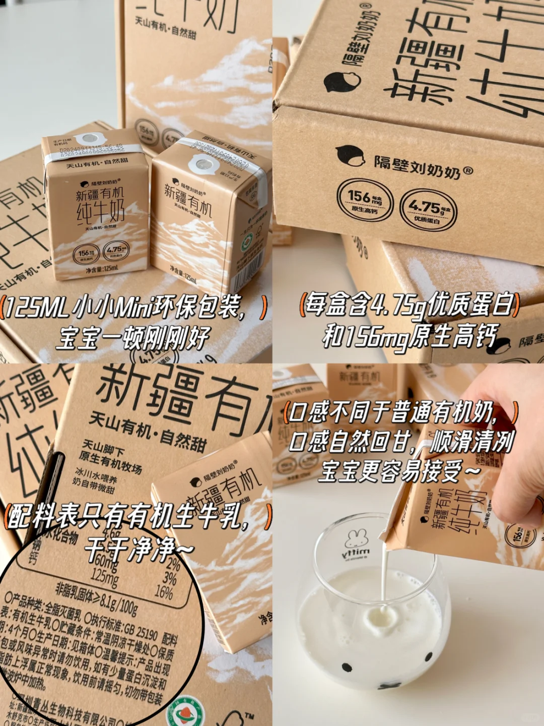 早餐挑两个喜欢的奶香小馒头,搭配口感浓厚奶香十足的隔壁刘奶奶新疆有机奶,营养又美味~最近很喜欢的牛奶无疑了,口感顺滑清冽,而且自然回甘,奶香浓郁,颠覆所有的有机牛奶了。作为一位宝妈,当然关注牛奶的蛋白质以及钙含量,每盒有4.75g蛋白质和156mg的钙!营养成分也拿捏的妥妥的,可爱精巧的包装设计,125ml刚刚适合宝宝一餐,满足宝贝的真实需求。[飞吻R]