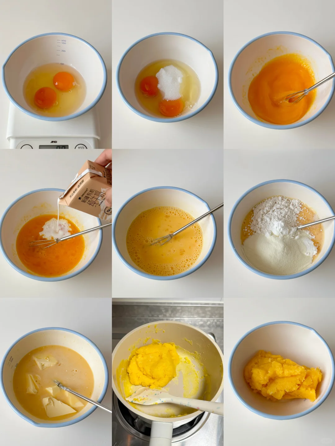 鸡蛋两个,细砂糖35g,盐1g,隔壁刘奶奶新疆有机奶70g,淡奶油30g,低筋面粉30g,奶粉20g,玉米淀粉20g,软化黄油35g