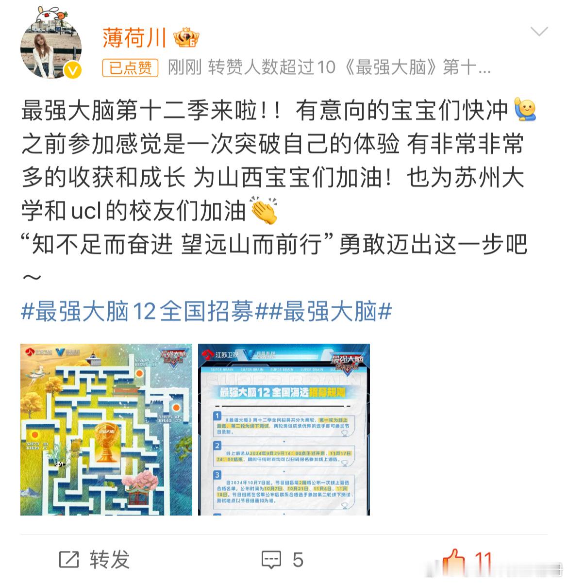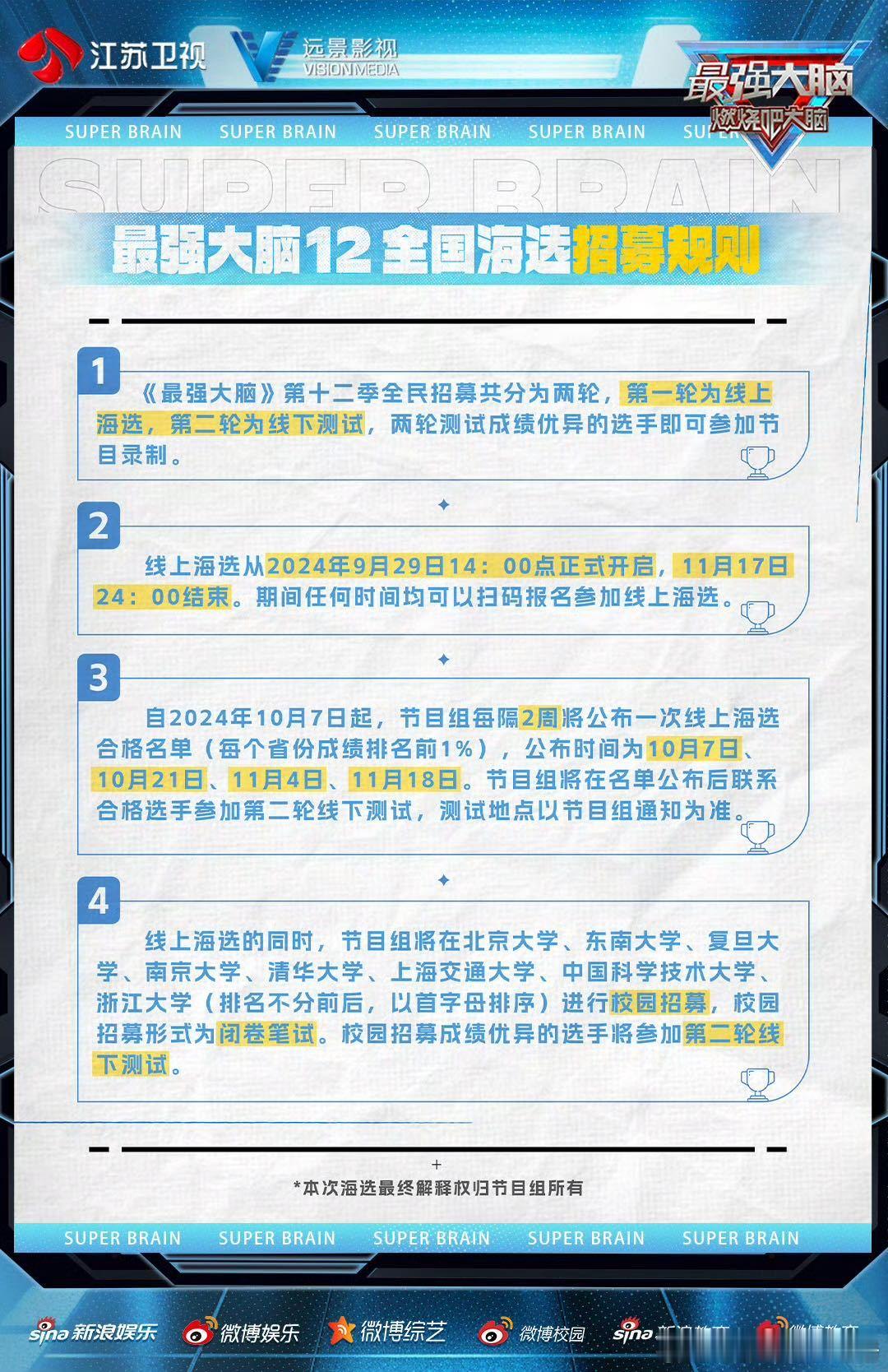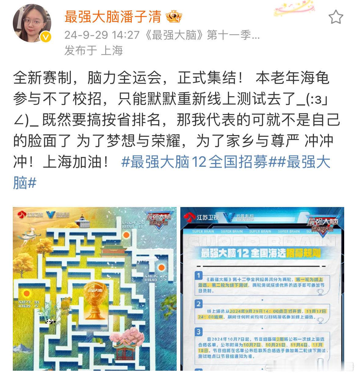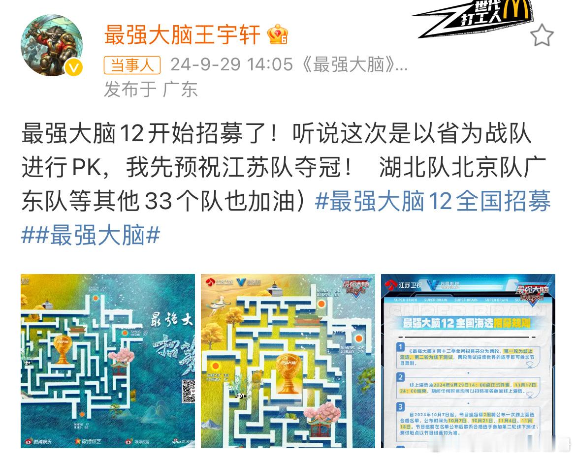 #最强大脑12全国招募##最强大脑#第十二季全国招募终于官宣了!妈妈们又可以拉着我们一起去看别人家的孩子了,第十二季的赛制主打全国巅峰脑力运动会模式,全国34省以团之名为省而战,这一次终于可以和妈妈统一战线,一起支持自己所在的省份。每次看大脑都可以刷新对人类智力的认知,已经开始新一季大脑的神仙打架名场面!