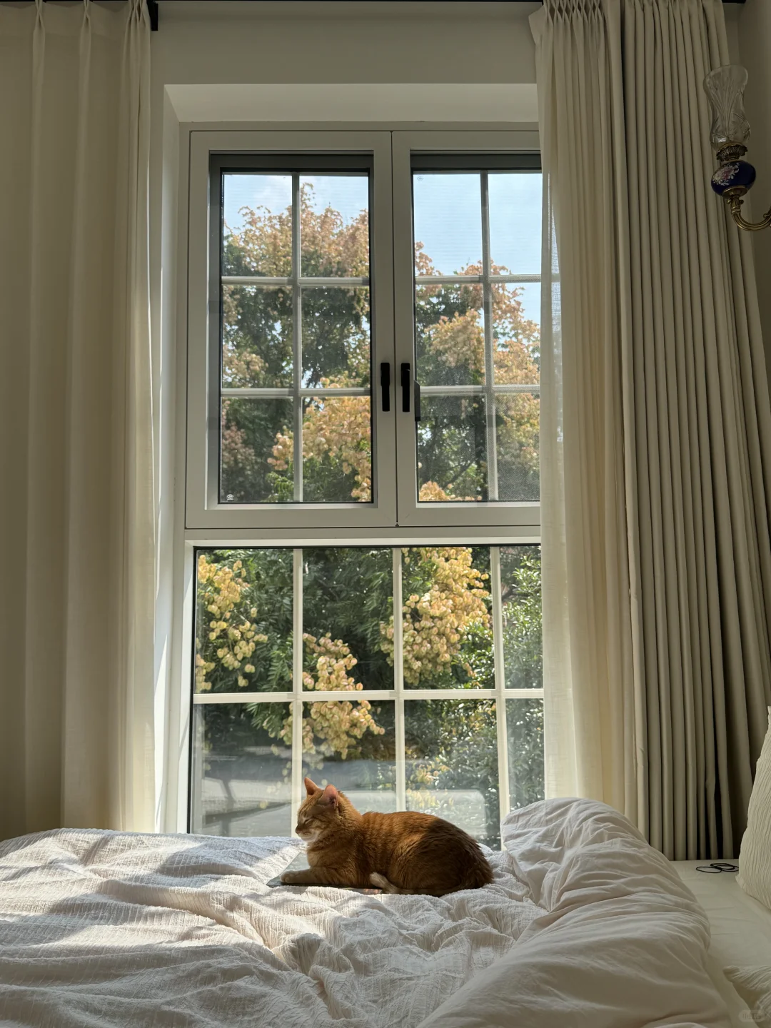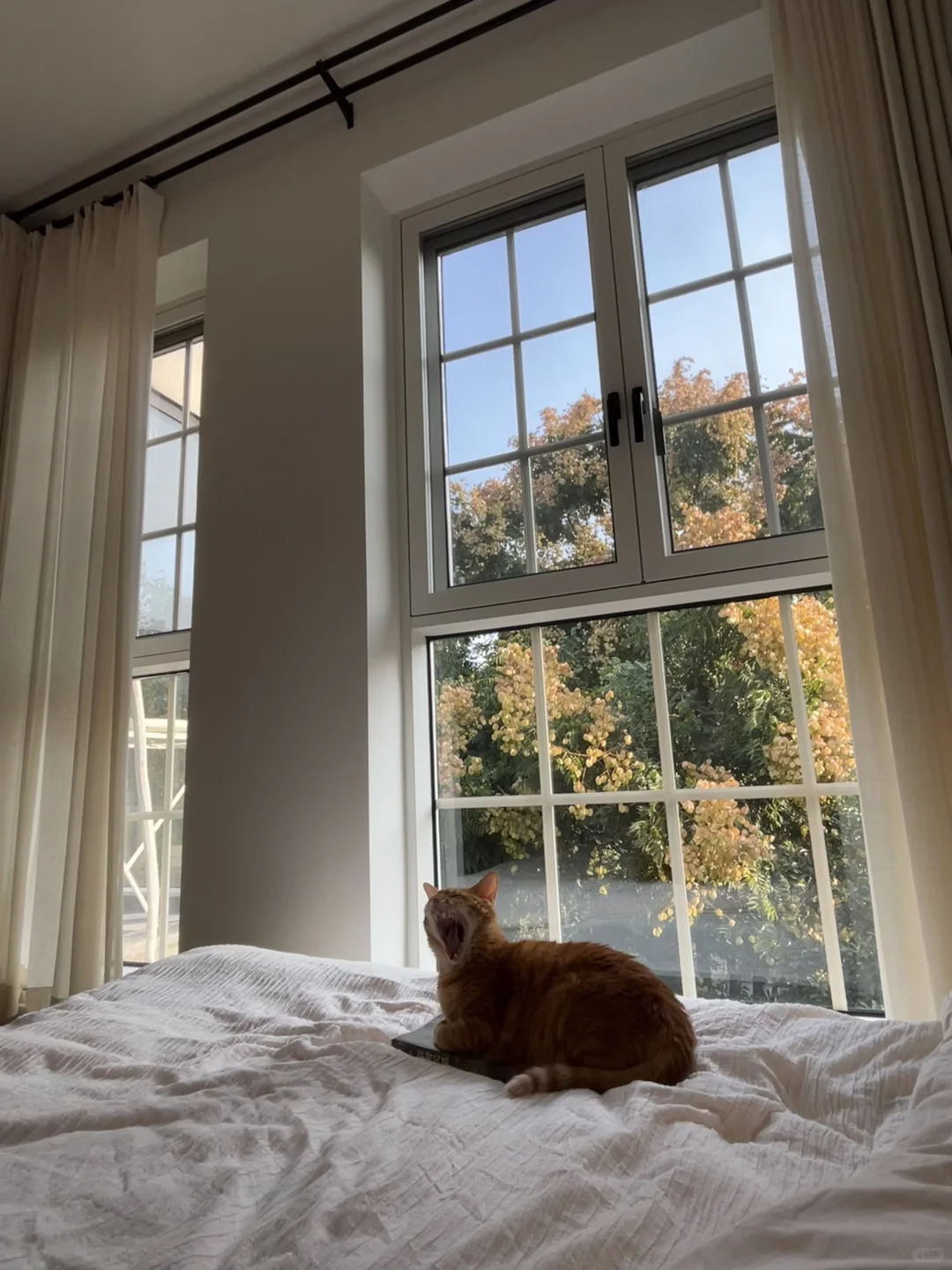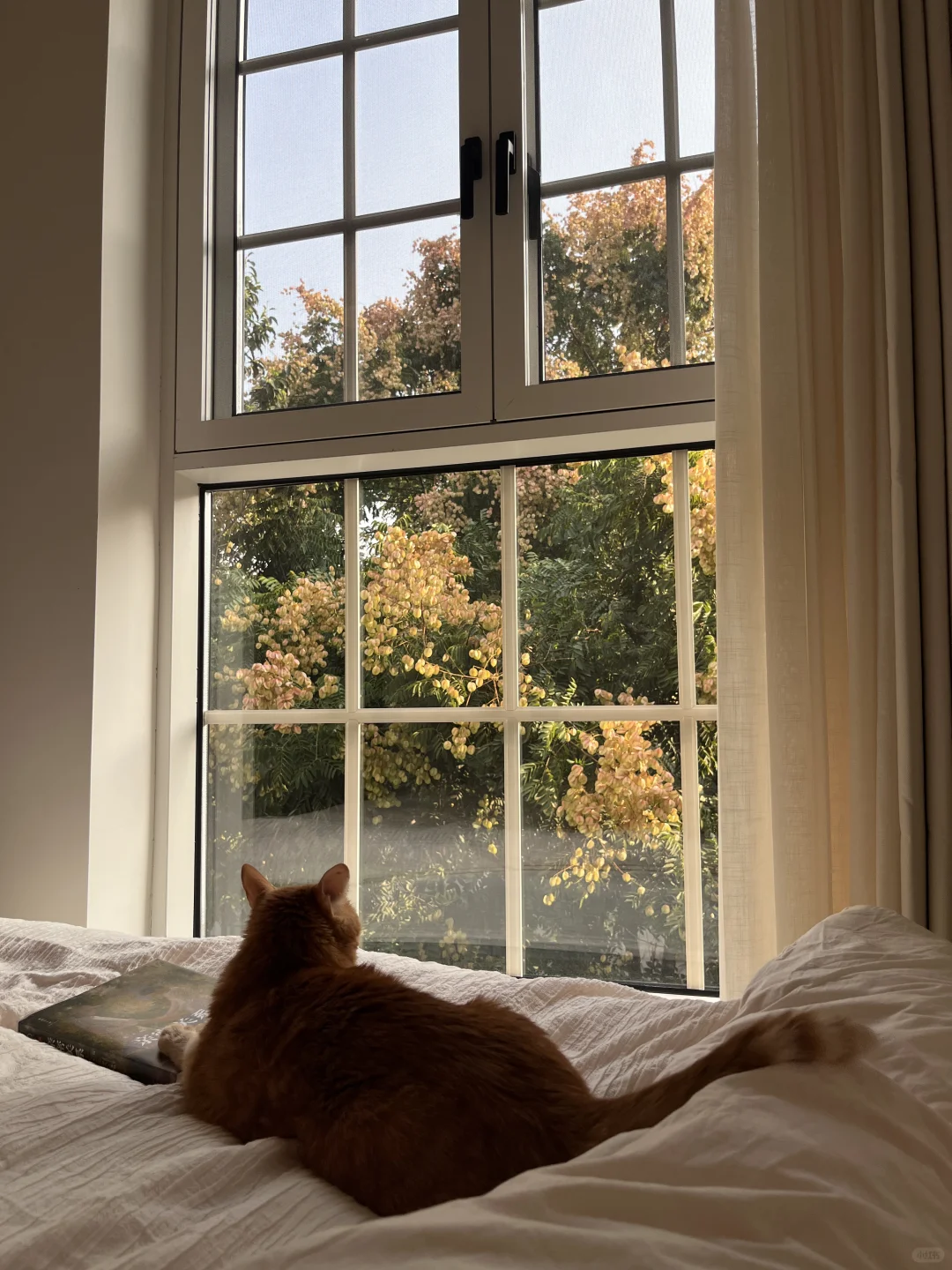 国庆前夕的午后 阳光甚好☀️ 主卧室从硬装结束至今一直没时间打理 秉持着边住边装的原则 有需求再布置 最近新添了张床垫暂时睡下啦 秋日美景疗愈 不可浪费 饼子尤其喜爱 光影落在她的金色毛发上 神喵下凡hh 栾树的红色果实被风吹的沙沙响 世界的喧嚣隔绝于这扇窗 只剩下大自然的低语 忙碌了一周的工作 更享受当下的慵懒惬意~ 马上迎来七天小长假 人在接近幸福时最幸福 希望时间在此刻静止⏱️
