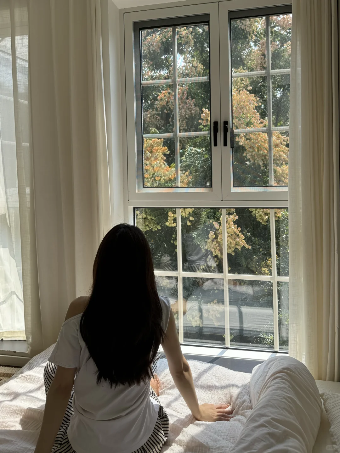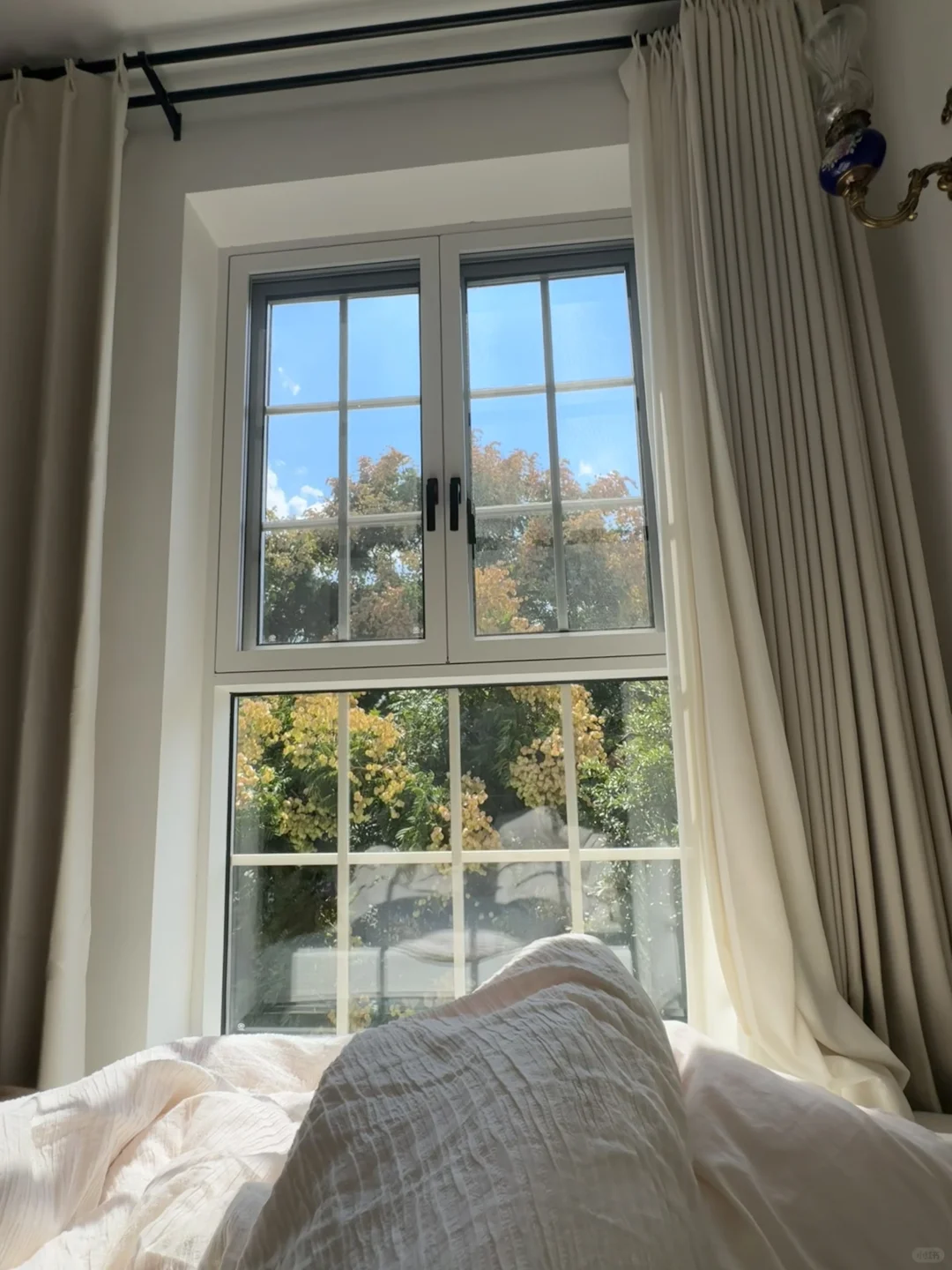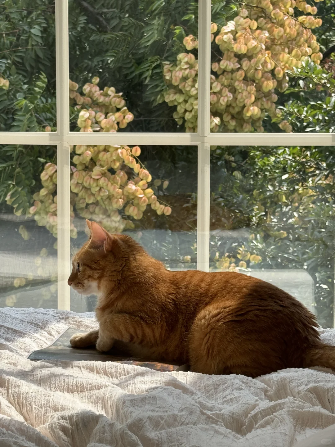 国庆前夕的午后 阳光甚好☀️ 主卧室从硬装结束至今一直没时间打理 秉持着边住边装的原则 有需求再布置 最近新添了张床垫暂时睡下啦 秋日美景疗愈 不可浪费 饼子尤其喜爱 光影落在她的金色毛发上 神喵下凡hh 栾树的红色果实被风吹的沙沙响 世界的喧嚣隔绝于这扇窗 只剩下大自然的低语 忙碌了一周的工作 更享受当下的慵懒惬意~ 马上迎来七天小长假 人在接近幸福时最幸福 希望时间在此刻静止⏱️