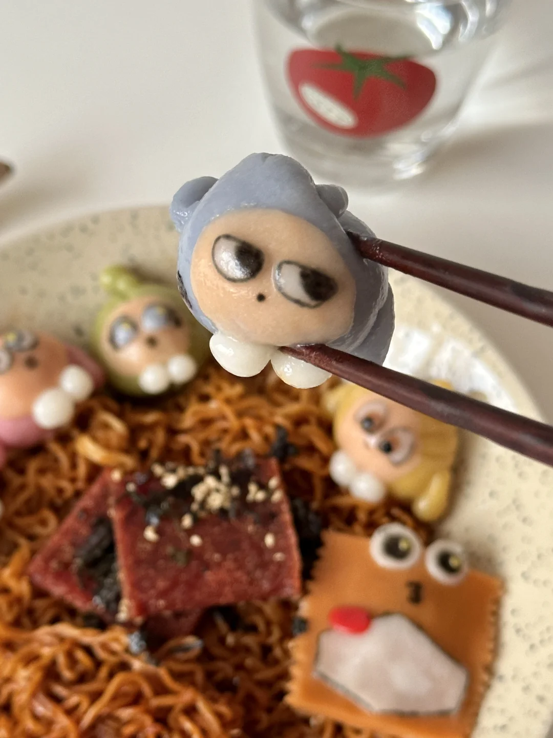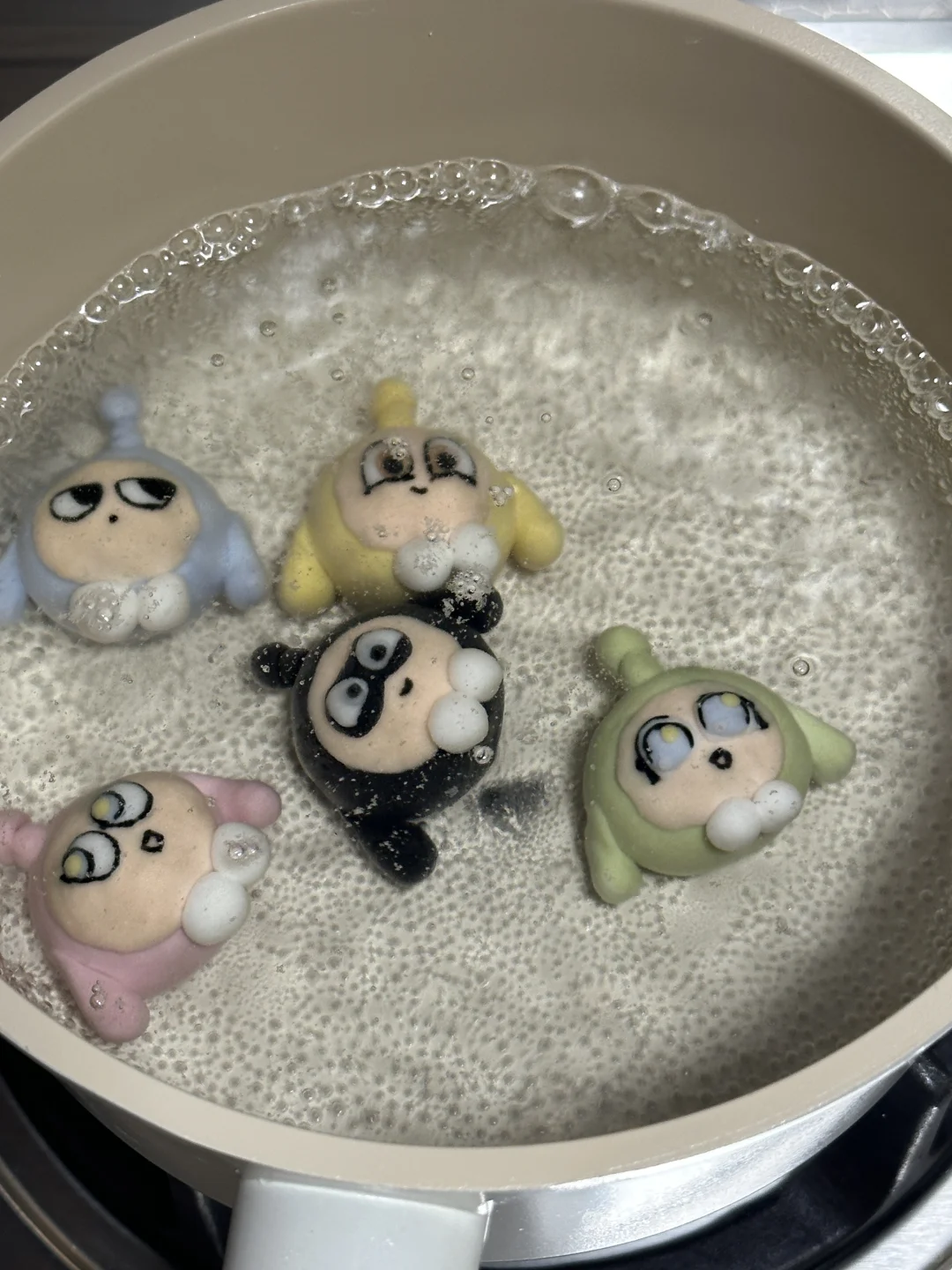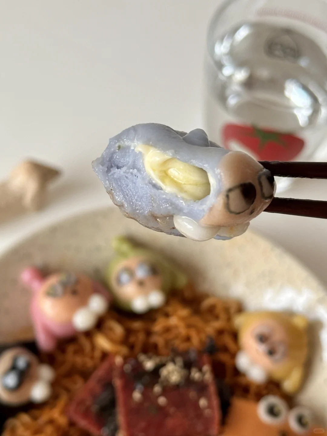 3️⃣包入芝士碎,捏出造型,眼睛部分细节要有耐心~最后用黑色可食用色素描边