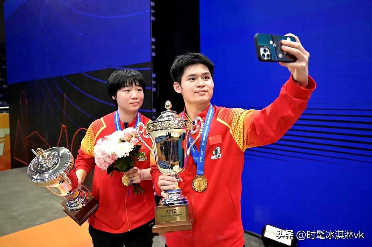 林诗栋/蒯曼混双夺冠后的自拍,小石头一如既往的速战速决[捂脸] 小石头举着手机自拍,一如既往的2秒结束战斗,和上次男团一样,再看看成品,蒯曼的眼睛都没有看镜头,还没睁太开[捂脸] 小石头还得跟你莎姐好好学学呀,莎莎又会指挥pose,又会拍照[捂脸] 小石头和蒯曼的混双,下一届奥运会应该就是他俩了吧!